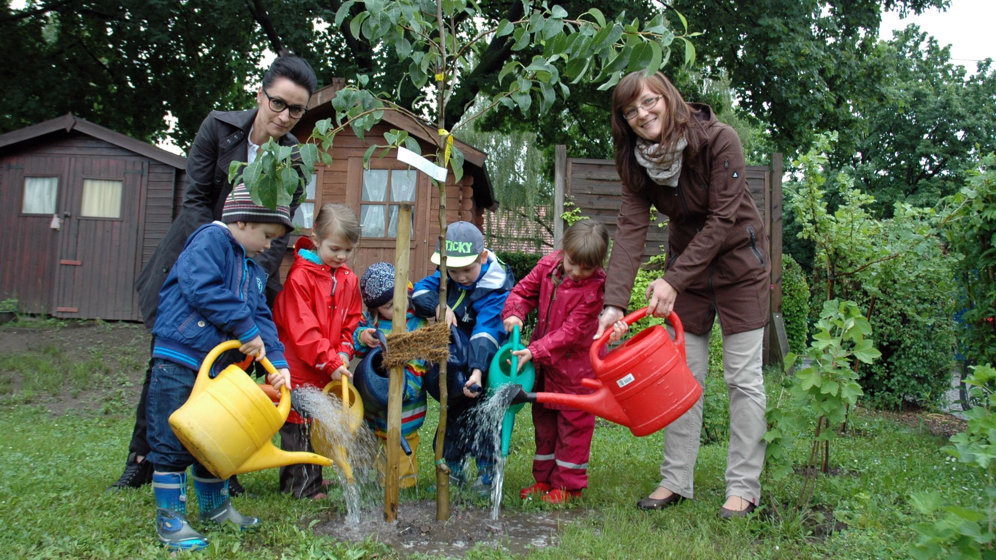 Garteneinweihung mit Gießkanne, v.l. Jonas, Annette Baumann (Filialleiterin Dresden-Neustadt), Selma, Mara, Elias, Janika und Stefanie Mahrla (Leiterin der Kita) Foto: PRAm Mittwoch wurde in der Kita „Kinderspiel e.V.“ auf der Johann-Meyer-Straße 35 offiziell der neugestaltete Garten eingeweiht. Neben Naschsträuchern, vielen Staudenpflanzen, einem Ahorn und einer Birke wurden fünf Brunnenringe als Hochbeet angelegt. Sie wurden bereits von den Kindern bepflanzt.