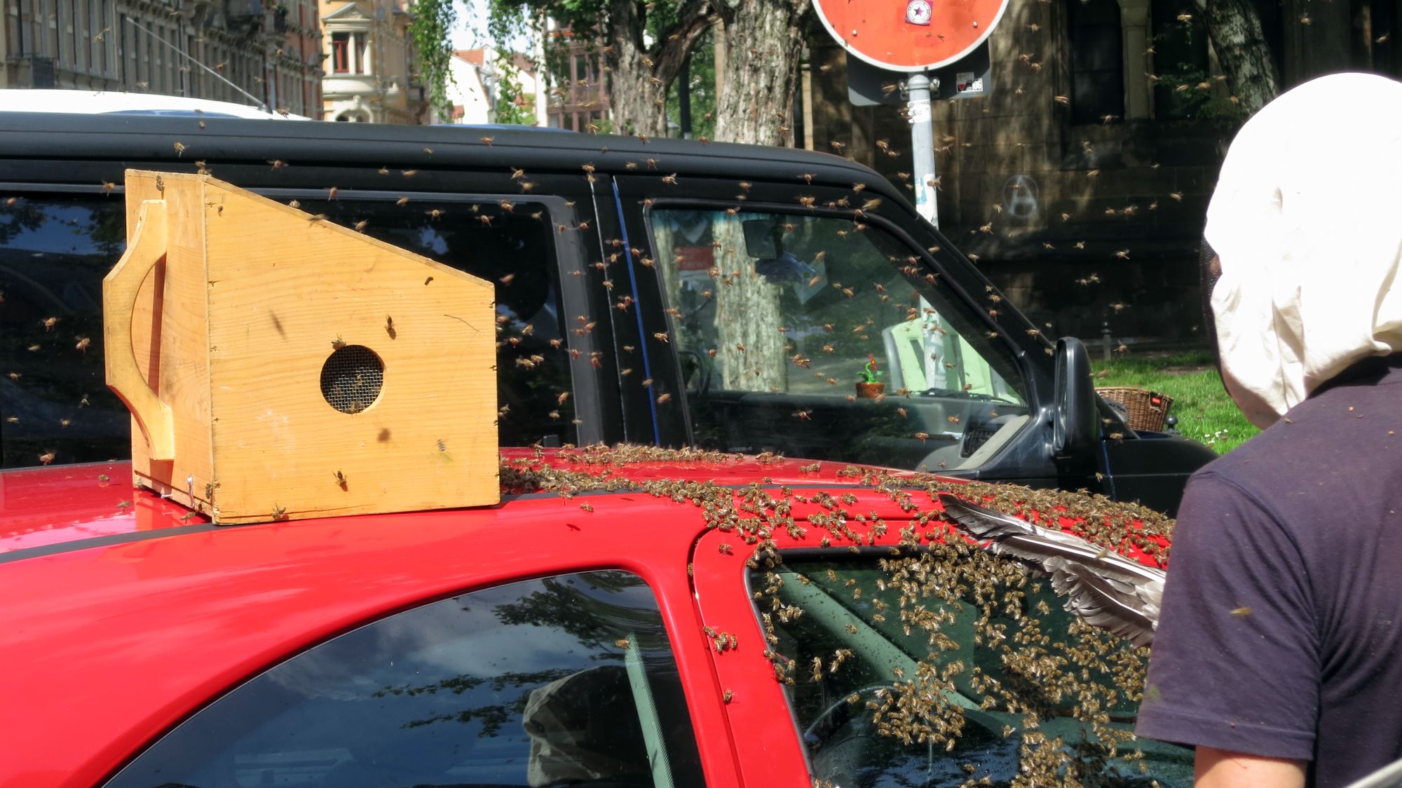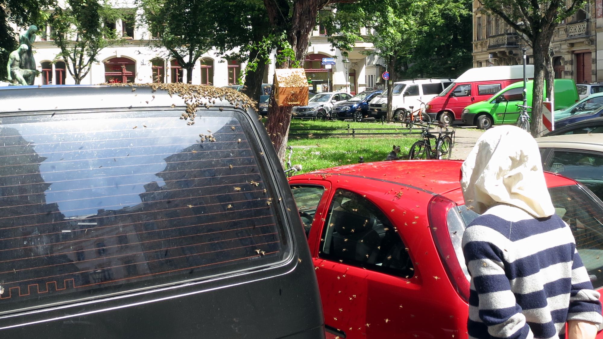 Am Martin-Luther-Platz befindet sich noch ein größerer Rest am VW-Transporter. Da kann ich nicht viel machen, die lösen sich bestimmt beim Losfahren auf. Am Martin-Luther-Platz hingen die Bienen recht lange und die Duftspuren sind noch recht stark, so das die Restbienen sich nicht so leicht auflösen wollen.
