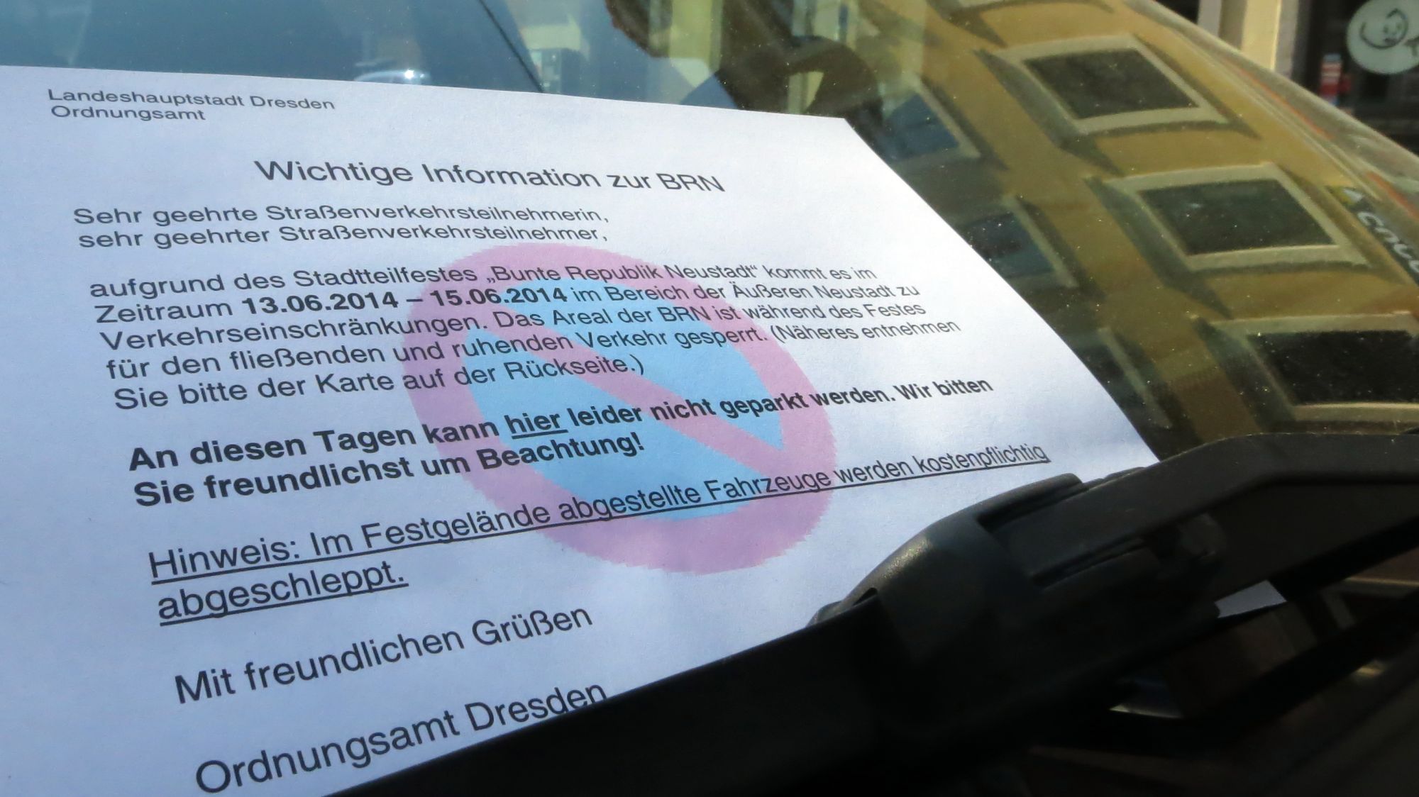 Autofahrer aufgepasst!Achtung! Autos dürfen im Festgebiet zwischen Bautzner Straße, Königsbrücker Straße, Bischofsweg und Prießnitzstraße vom 13. Juni, 16 Uhr, bis 15. Juni, 24 Uhr, nicht fahren. Die Förstereistraße und die Jordan- und Louisenstraße bis zur Förstereistraße sind genauso befahrbar wie die Prießnitzstraße. Das Halteverbot auf dem Fest-Gelände gilt von Freitag, 9 Uhr, bis Montag, 6 Uhr. Voll gesperrt sind zudem die Tannenstraße und der Bischofsweg zwischen Kamenzer Straße und Förstereistraße. Das Ordnungsamt weist vorsorglich darauf hin, dass abgestellte Fahrzeuge im Festgelände und auf der Tannenstraße kostenpflichtig abgeschleppt werden.