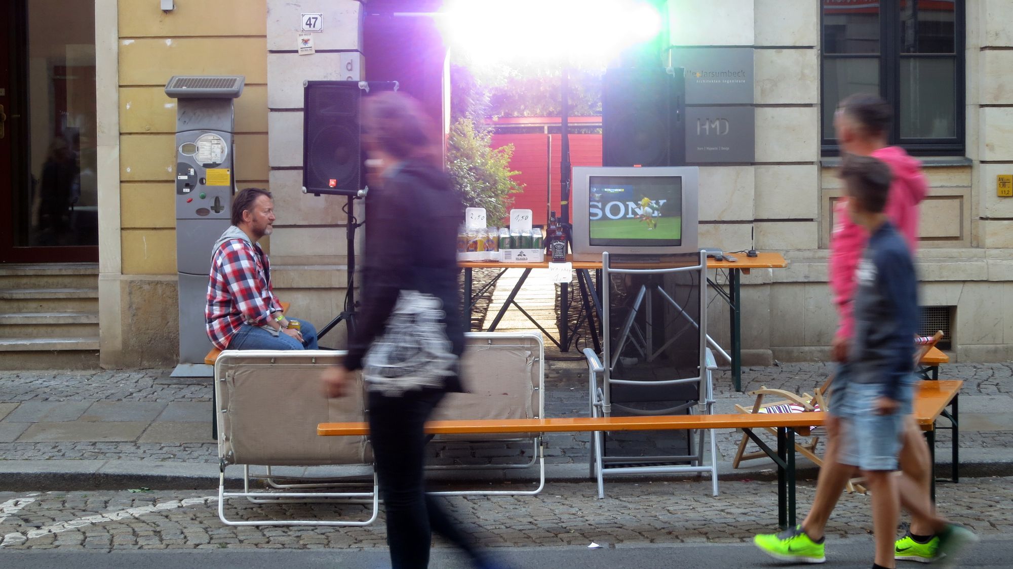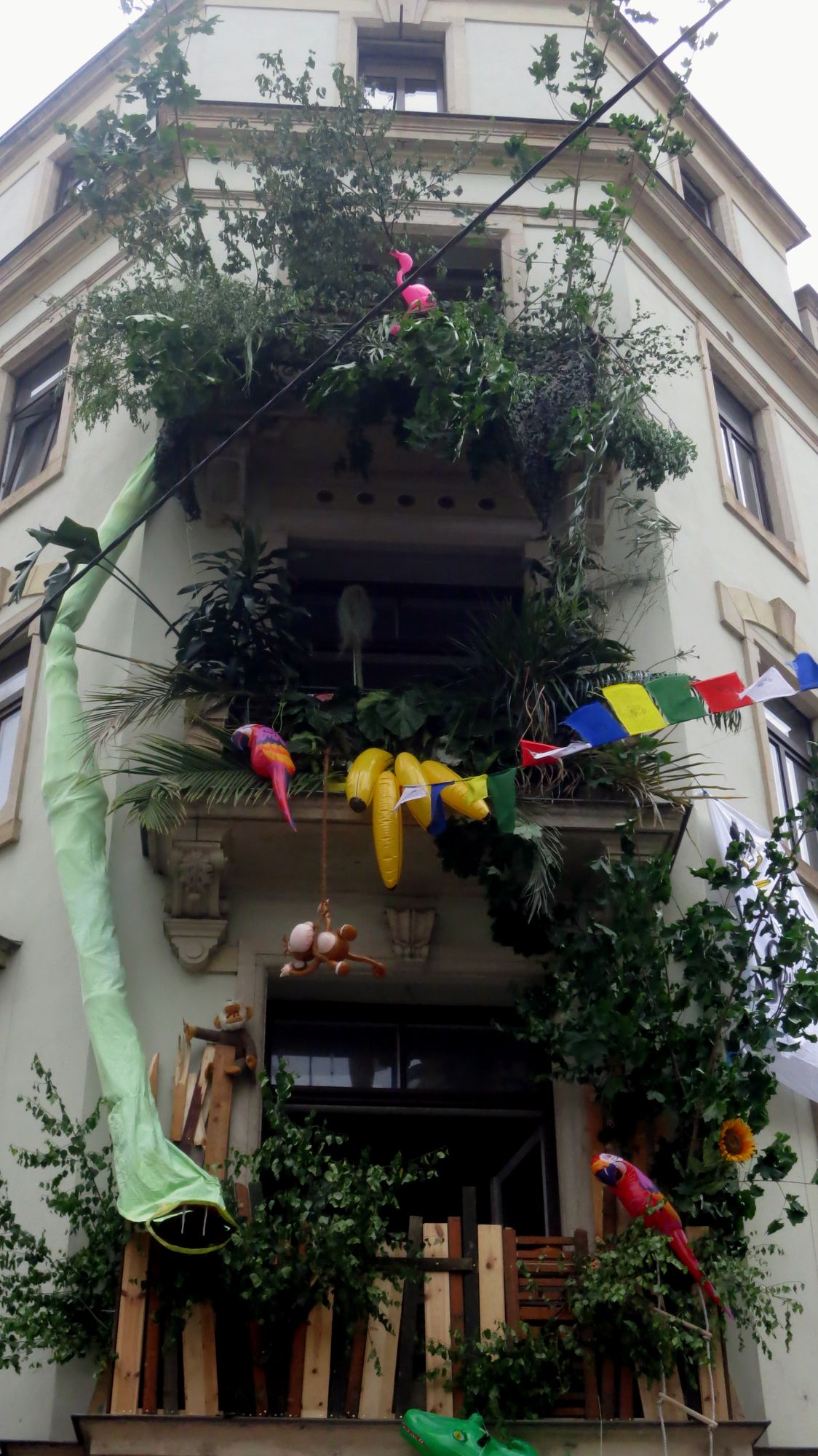Und spätestens ab 18 Uhr war die Neustadt voll. Zwar musste das Ordnungsamt nicht wie im Vorjahr die Zugänge sperren, dafür waren aber auch die sogenannten Nebenstraßen im Osten der Repbulik deutlich voller als noch 2013.Ab dem späten Nachmittag war es voll.Die Bewohner des Hauses an der Louise-/Ecke Martin-Luther-Straße haben sich wieder ordentlich ins Zeug gelegt. Wer dachte, der Knüller des Vorjahres mit der „Unsinkbar 2“ sei nicht zu toppen, kann sich nun vom wohl grünsten Haus der Neustadt begeistern lassen. kämpft um den Titel „Schönstes Haus der Republik“Auf der Alaunstraße gab es ganz nebenbei ein paar Infos. Der Fisch-Laden hat zu, weil der Koch nicht mehr so will, wie Inhaber Cengiz Genç gern möchte. Der überlegt nun, ob er an dieser Stelle künftig Pizza oder Pasta anbietet. Ein paar Schritte weiter gen Albertplatz hat gestern Alessio Mallo ein italienisches Spezialitäten-Gechäft eröffnet. Während des Republik-Geburtstages gibt es aber erstmal nur Eis. Vorm „Trotzdem“ treffe ich Anamateur, die eigentlich Karten legen wollte, aber die waren dann irgendwie nicht da, so blieb es beim Biertrinken. Ein paar Schritte weiter rappt Gisela Björn „für die Neustadt“ und die Jugendlichen rundum stimmen ein.