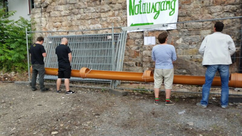 Die Empörung setzt sich fort: Neben dem Häuschen ziert eine orange Rinne das Bauzaun-Panorama, vier der männlichen Spezies befreien ihr Fühlorgan ungeniert von ihrer wärmenden Ummantelung und feuern ein strahlförmiges Gewitter vor sich ab. Aus der Reihe vor dem Blechhaus hört man Schnaufen und Stöhnen, Krallen werden ausgefahren. Der Wachhund am anderen Eingang macht seinen Job sogar so gut, dass sich nicht mal mehr die Fühlorganler an ihm vorbei trauen und lieber zur Rinne flüchten. „Ich mach keine halben Sachen“, so sein Statement.