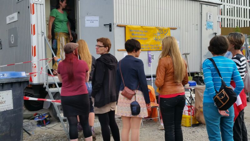 Auf höfliches Nachfragen, was es mit den mobilen Hütten auf sich hat, reagieren die Münder des Plagegeistes gereizt. Ein nervöses Zucken in den Gliedern verrät, dass es sich um eine äußerst dringliche Angelegenheit handeln muss. Schließlich schreit Inken – extra aus dem Schwarzwald angereist, um ihre Solidarität zu zeigen – aus Leibeskräften: „Ich wollte doch einfach nur meiner Blase Luft verschaffen!“. Wimmernd steht Inken in der Schlange, Tränen glitzern in ihren Augen, es geht nur schleppend voran. Inken erzählt mit zittriger Stimme, dass der Wachmann am anderen Eingang sie nicht vorbei gelassen hätte. „Du kommst hier net rein, dir fehlt das Fühlorgan“, habe der Aufpasser ihr vor die Füße geschleudert. „Befehl von ganz oben!“, waren seine letzten Worte.