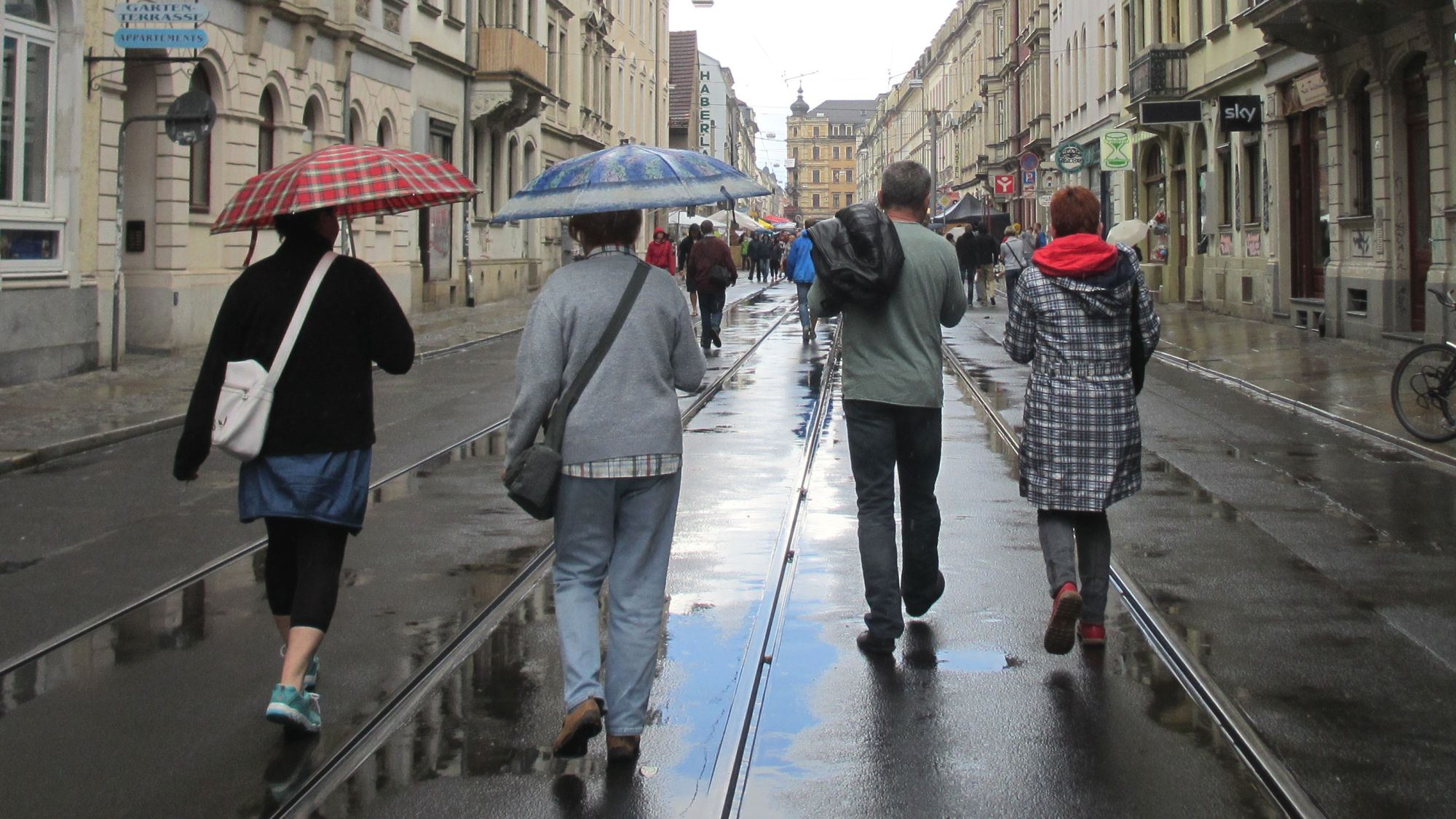 Auf der „Rothenburger“ kloppen mir die Techno-Rhythmen ins Hirn. Kein Wunder, dass die Teenies sich hier per Bierbong auffüllen müssen. Ich schiebe, werde geschoben, die Mundwinkel erreichen die Kniekehle, staune über einen vergleichsweise leeren Kunsthof und strande am Alaunplatz. Ein junger, dünner Bursche lockt mit „free Hugs“ … Ach was solls, ich drücke ihn und fühle mich doch nicht besser.