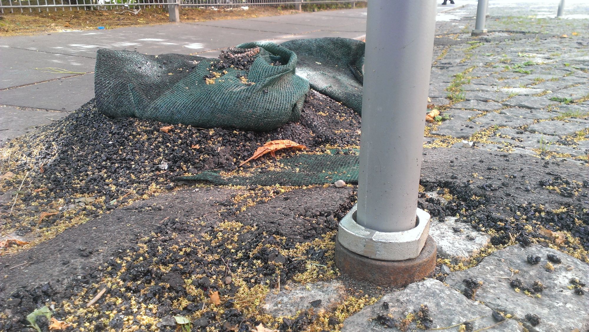 Denn zwar wurden die Bügel in weiser Voraussicht herausschraubbar montiert. Doch leider nicht ebenerdig, so dass sich Stolperfallen ergaben. Um nun zur BRN das große Massenstolpern zu verhindern, wurden die Bügelhülsen ordentlich verhüllt. Jetzt stehen die Bügel wieder, aber leider sind nun die Reste der Verhüllungen die Stolperfallen. Also: Augen auf am Fahrradbügel.