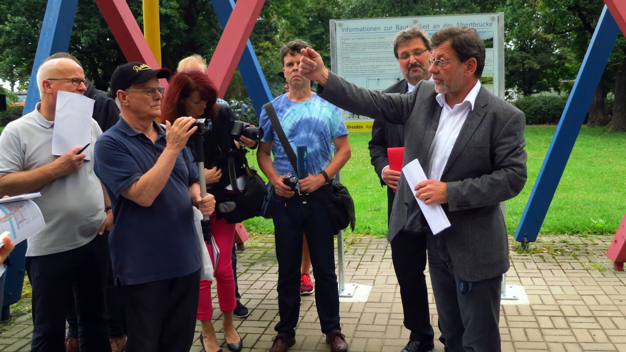 Professor Reinhard Koettnitz erläutert den Pressevertretern den Fortgang der Bauarbeiten.Koettnitz weiß auch schon, wohin die Autofahrer ausweichen werden. „Auf der Carolabrücke wird der Verkehr um bis zu zehn Prozent zulegen“, spekuliert er. Das könne gerade am Carolaplatz zu Stauerscheinungen führen. Aber auch auf der Waldschlösschenbrücke, über die im Moment ca. 35.000 Autos fahren, werden es wohl pro Tag bis zu 4.000 mehr werden. Die Vollsperrung, seinerzeit im Stadtrat ziemlich umstritten, ist nötig, damit die Brücke relativ schnell saniert werden kann. Die Straßenbahn hat nun ein Baugleis auf der westlichen Brückenhälfte erhalten und im Osten kann nun mit voller Baufreiheit gearbeitet werden. Dann wird die Brücke bis zum Gewölbe zurückgebaut, um sie dann verbreitert neu aufzubauen. Dabei werden die Gewölbe ausgeräumt und neu mit Beton gefüllt. Die Pfeiler und Stirnwände werden aufgehöht, eine lastverteilende Platte neu hergestellt und diese abgedichtet. Außerdem stellen die Baubetriebe die Entwässerungsrinnen her und verlegen Leitungen neu. Im Anschluss werden die Fahrbahn und das Straßenbahngleis neu aufgebaut und die Kappe neu hergestellt.