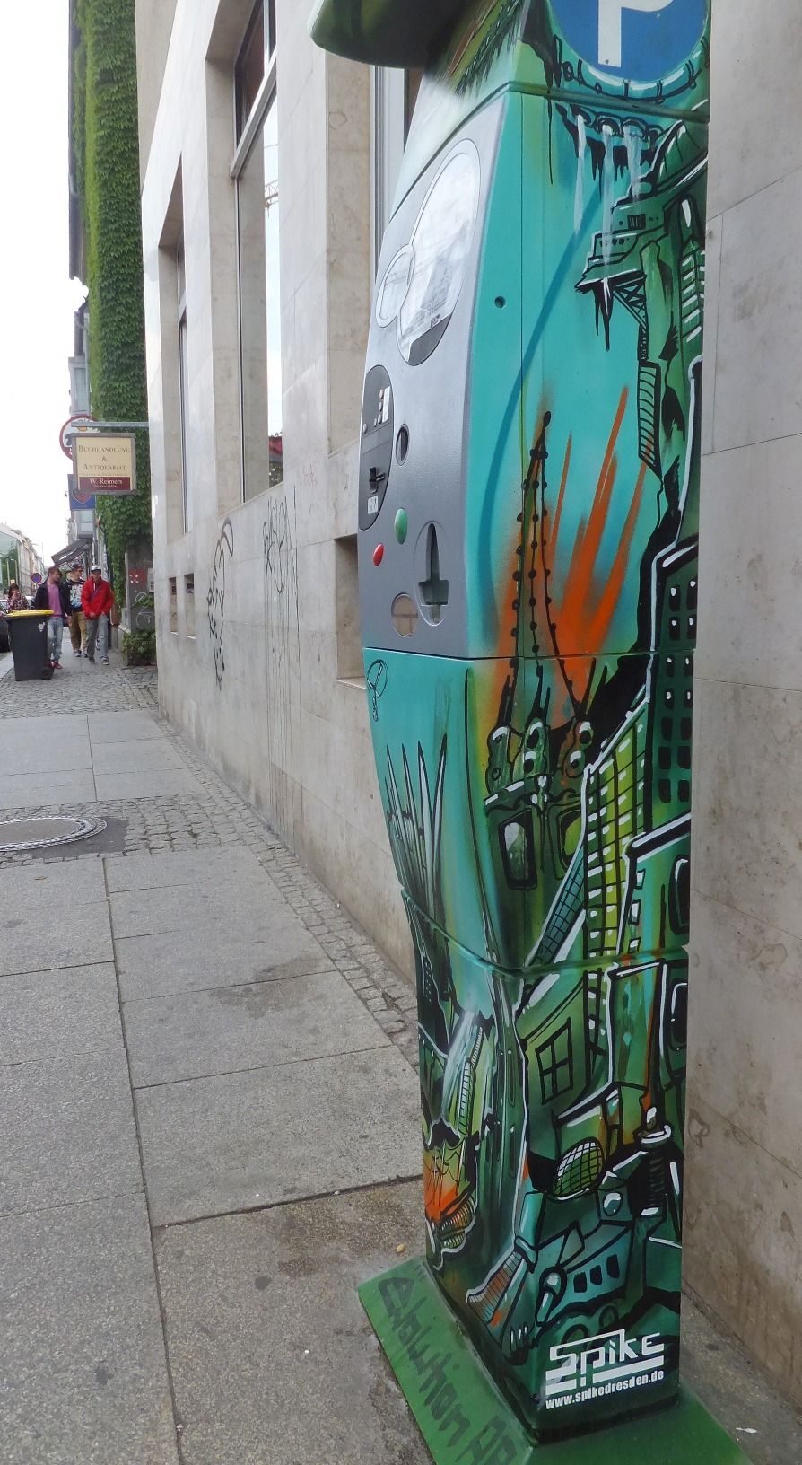 Am Rande des Dresdner Urban Art Festivals „LackStreicheKleber“ haben auch ein paar Parkscheinautomaten auf der Alaunstraße einen neuen Anstrich bekommen. Die Funktion der gebührenpflichtigen Parkberechtigungsdrucker wurde dadurch nicht eingeschränkt.