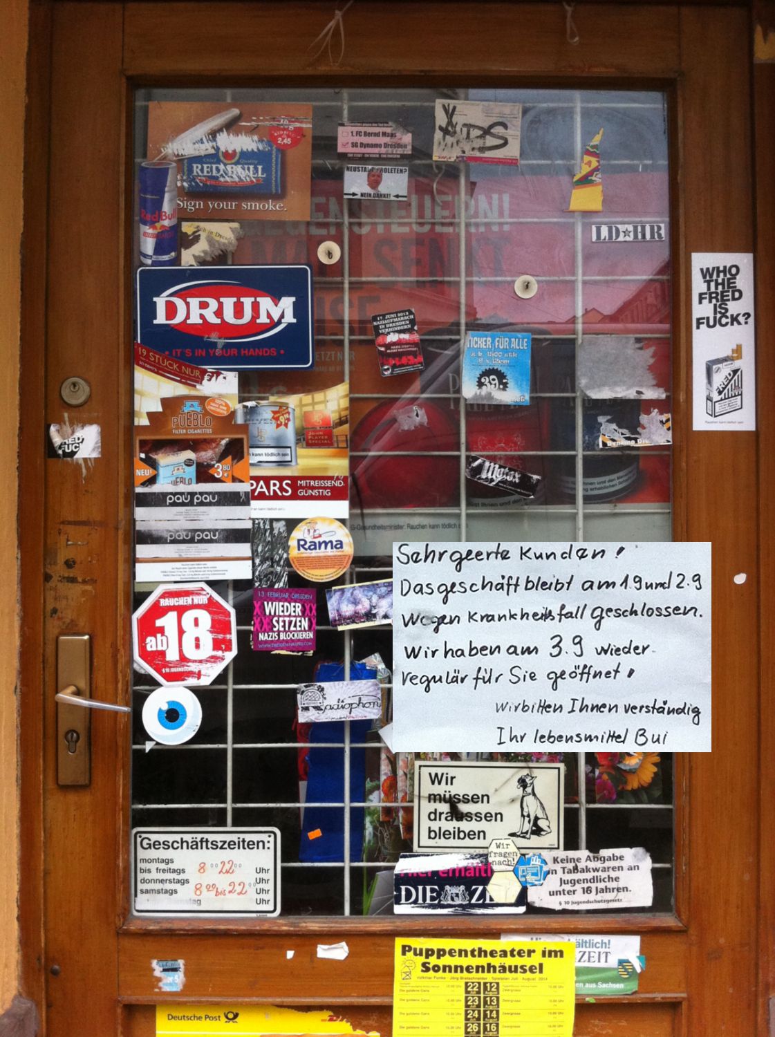 Verstörte Kunden berichteten mir, seit gestern habe der beliebte Lebensmittel- und Allerlei-Laden auf der Louisenstraße geschlossen. Auf einem winzigen Zettelchen steht die Erklärung.