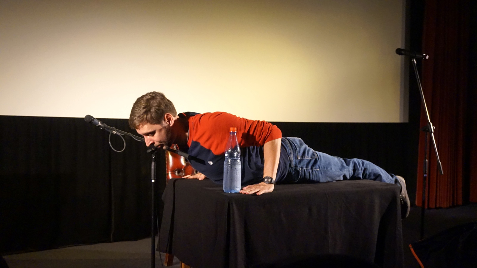 „Regel Nummer 1: Dem Publikum ordentlich das Gehirn wegblasen, bevor es eine faire Chance hat, über Gehörtes nachzudenken. Check. Regel Nummer 2: Einheimsen, was einzuheimsen geht oder anders ausgedrückt: „Analoges Ground Founding“. Ein Werthers Original, ein Popcorn und ein rotes Gummibärchen – keine schlechte Ausbeute. Check. Regel Nummer 3: Im Vorfeld Warnhinweise aussprechen – legitimiert Sexismus und den ganzen anderen Quatsch: „Wenn Sie schwarzen Humor nicht verstehen, Markus Lanz-Fan oder schwanger sein sollten, haben Sie jetzt die Chance den Raum zu verlassen und sich mit Selbstmitleid zu besaufen.“ Check. Memo an mich selbst: Ich bin nicht Homer Simpson, der Affe mit den klirrenden Becken in meinem Kopf ist nicht real.“