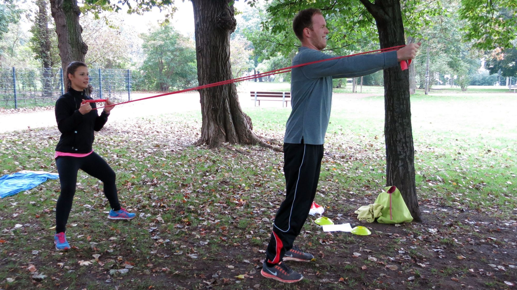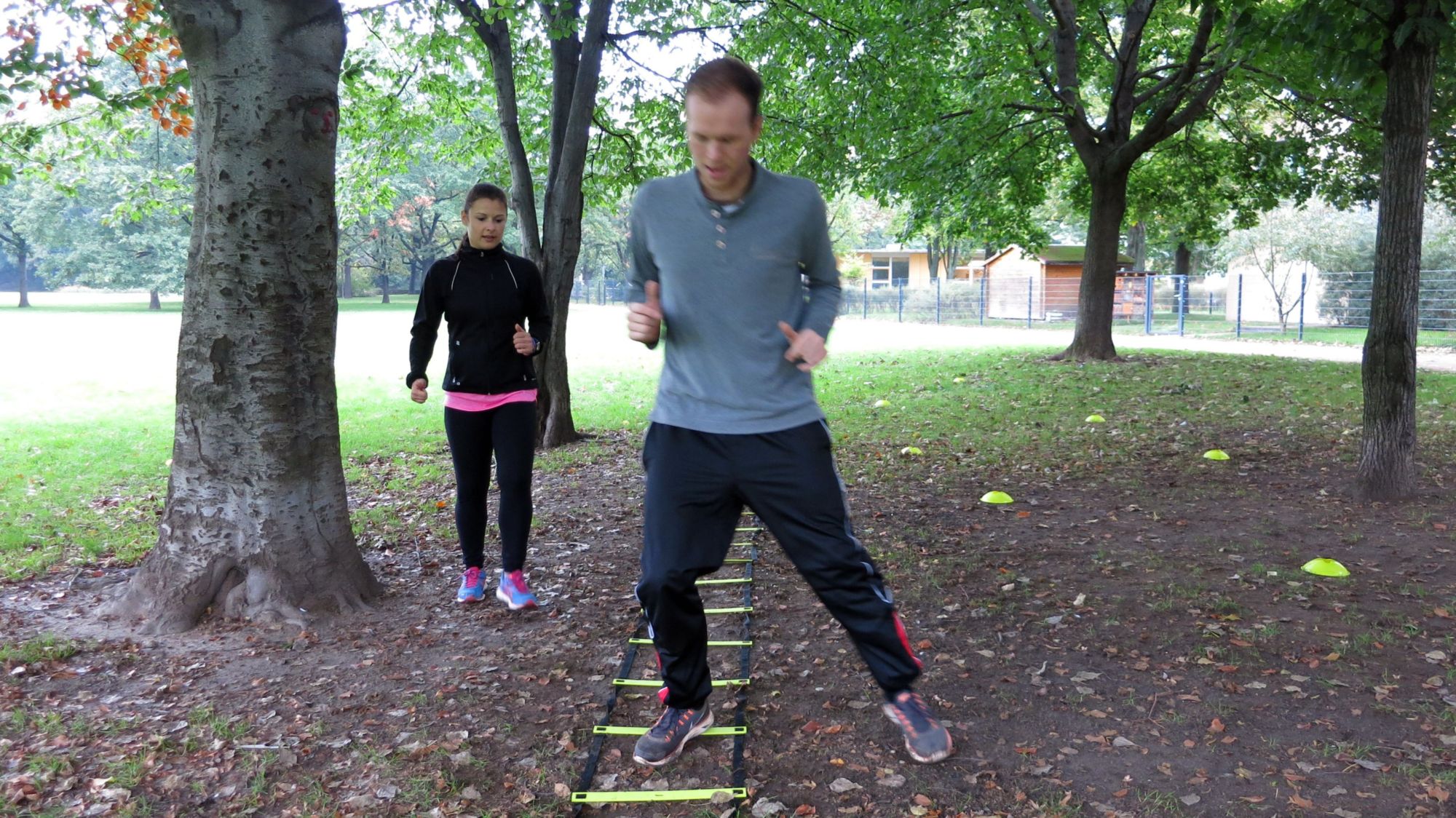 Er springt, rennt, geht tief, wieder hoch. Weiter. Weiter. Sie steht daneben, zählt laut, ruft motivierend. Dann: kurze Pause. Georg darf verschnaufen, Luft holen, bevor es wieder weiter geht. Claudia steht neben ihm, lächelt, schaut auf die Uhr und treibt ihn erneut an. Neugierige Passanten drehen schon den Kopf.
