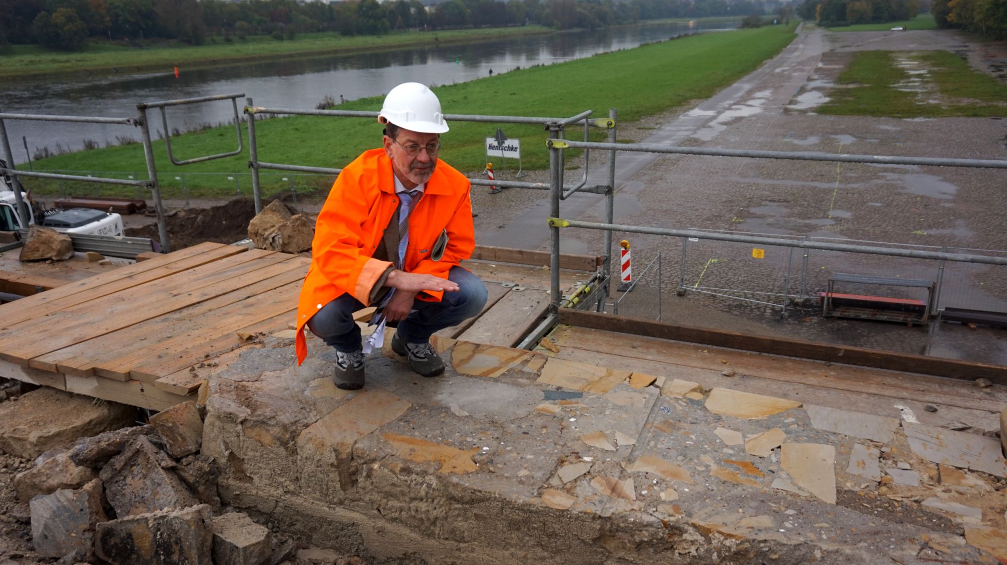 Die Brücke ist nach wie vor für den Kraftfahrzeugverkehr gesperrt. Die „13“ und die „6“ fahren über das provisorische Gleis und Ersatz-Brücke kann von Fußgängern und Radfahrern benutzt. werden.