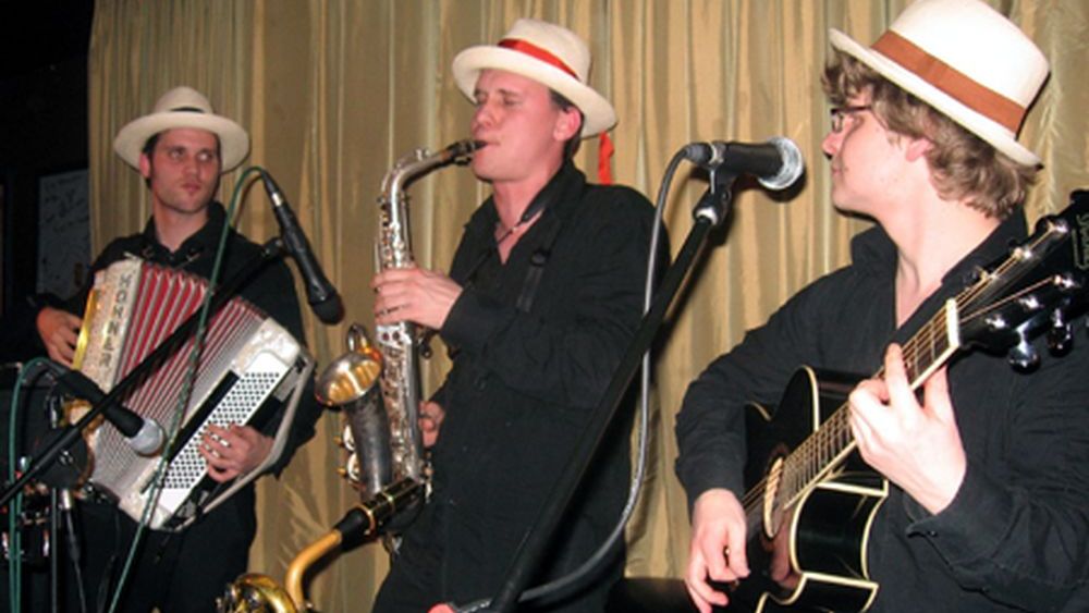 Die Bagels im Blue Note.Kurz nach neun kam ich an. Die Bar auf der Görlitzer Straße war rammelvoll. Per Blick-Kontakt und Zeichen konnte ich ein Bier ergattern. Als meine Brille, die natürlich wieder mal beschlagen war, endlich die Sicht frei gab, sah ich mich um. Ach ja, Musiker müsste man sein. Um mich rum haufenweise hübsche Mädels in Feierlaune. Der Grund dafür stand auf der Bühne, die Bagles, ausgestattet mit Quetschkommode, Klarinette, Gitarre, Geige und weiteren Musikinstrumenten schrammelte wild drauf los. Die Bagles, das sind Matthias Müller, Simon und Georg Schumann. Eigentlich ist das ja nicht so meine Musik: Tango – das ist doch was für Intellektuelle, aber die traurigen Klänge passten sowohl zu meiner Stimmung als zum Wetter draußen.