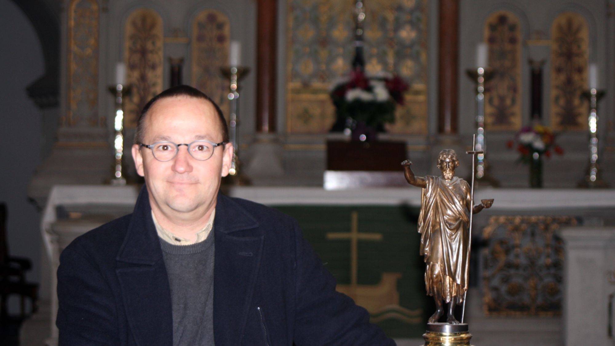 Auf die Frage nach seinem Lieblingsplatz in der Kirche, überlegt der Pfarrer kurz: „Ganz hinten in der letzten Reihe, als Teil der Gemeinde“, dann schiebt er nach: „oder auf dem Turm mit der überwältigenden Aussicht“. Doch dann legt er sich fest: „Vor der Gemeinde, den Altar im Rücken.“ Wenn er dort stehen und den Segen Gottes vermitteln kann.