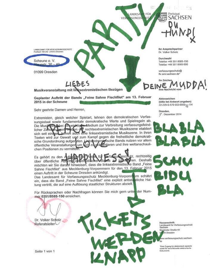 Am 13. Februar soll in der Scheune die Punkrock-Band „Feine Sahne Fischfilet“ spielen. Wie die Band jetzt auf ihrer Facebook-Seite veröffentlichte, hat das Landesamt für Verfassungsschutz den Scheune e.V. angeschrieben. In dem Schreiben heißt es unter anderem: „Das Landesamt für Verfassungsschutz Mecklenburg-Vorpommern schätzt ein, dass die Band … eine explizit antistaatliche Haltung vertritt, die auf eine Auflösung staatlicher Strukturen abzielt.“