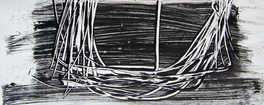 Die Ausstellung heißt „Netzwerk“ – hier zeigt Bärbel Voigt vor allem grafische Strukturen, lineare Vernetzungen, die sich prototypisch wiederholen und so das Potenzial ihrer seriell angelegten Bildfolgen bilden. In Versuchsreihen variiert sie Überlagerungen, Einschübe und visuelle Störsignale. Die Linie ist für sie der verbindende Faktor, das lebendige Medium, das die einzelnen Bildelemente bündelt und dominiert. Durch die optische Überlagerung von schwarzer und weißer Strichzeichnung erlangen ihre Arbeiten eine Raum und Tiefe.