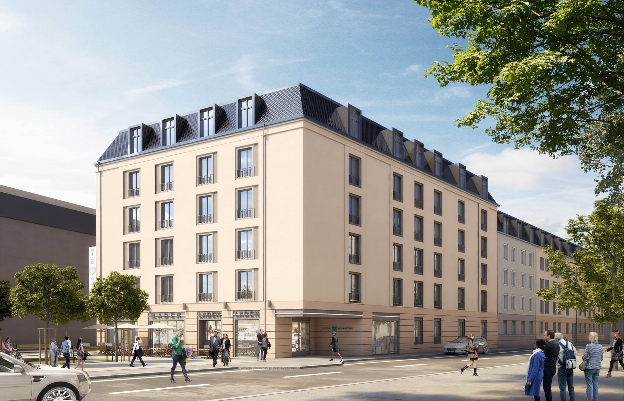 So soll es mal aussehen – Visualisierung: HeadquarterDas neue Haus zwischen Holzhofgasse und Bautzner Straße soll im kommenden Jahr fertig sein, laut Pressemitteilung bis zum Sommersemester. Die Wohnungen werden in unterschiedlichen Größen angeboten, sind jedoch immer nur für eine Person geeignet. Der Entwurf stammt von dem Dresdner Büro der Architekten nps tchoban voss. benchmark. In der Pressemitteilung heißt es: „Moderne Formensprache, integriert in die Umgebungsbebauung – das ist dem Unternehmen wichtig.“ Geplant ist im Erdgeschoss an der Westseite, hin zu dem kleinen Platz am Pferdebrunnen, Gewerbeeinheiten zu schaffen, dort sollen kleine Läden und Gastronomie einziehen.