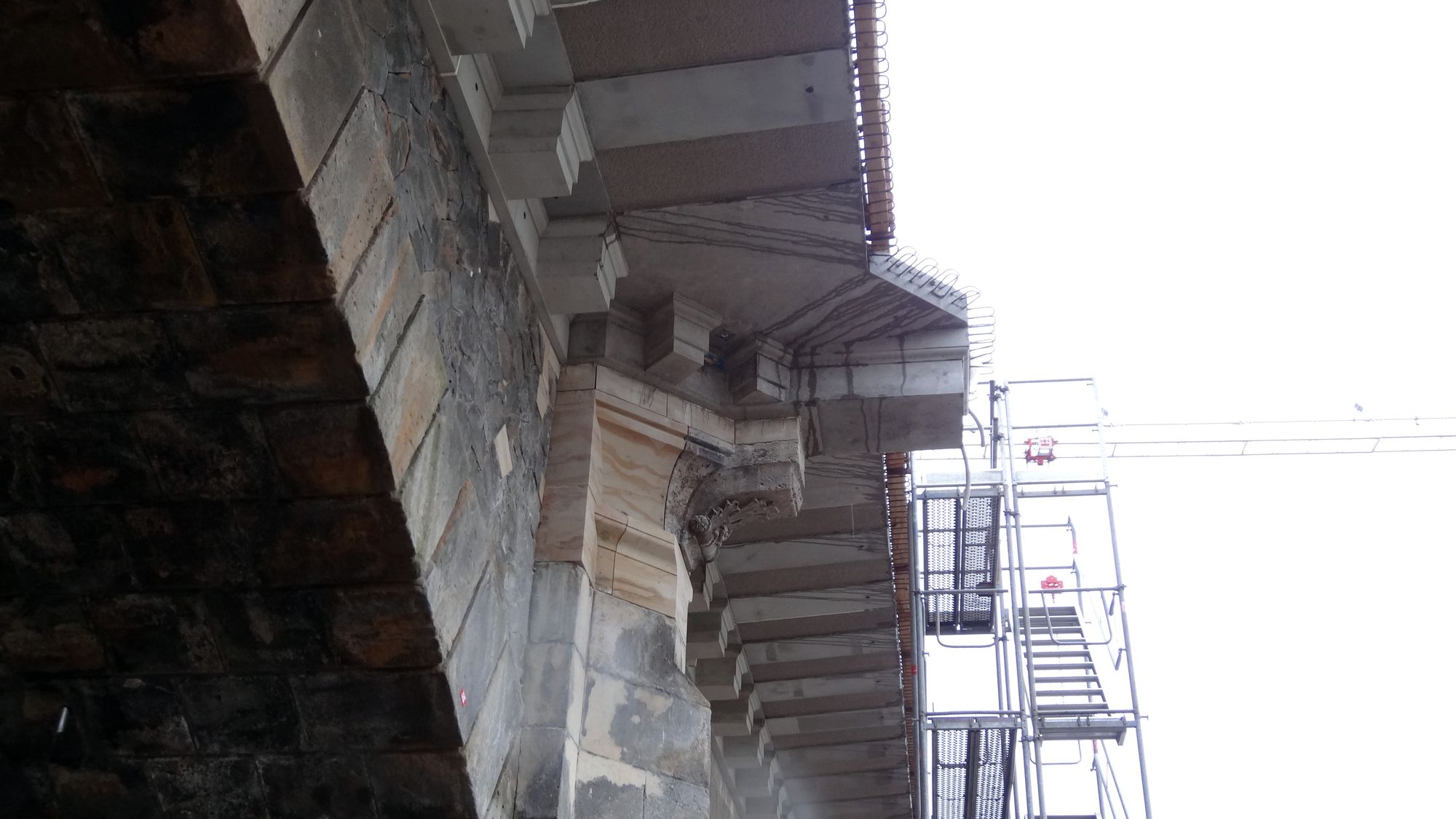 Insgesamt zwanzig der vierzig benötigten Betonsegmente sind seit November schon gegossen worden. Wenn man die Brücke vom Elbufer aus betrachtet ist die neue Brückenbreite gut zu erkennen. Die Brückenkanzeln werden später nicht mit Sandstein verkleidet. Auf der Johannstädter Seite sind die Ausbesserungsarbeiten an vielen Pfeilern der Brücke bereits abgeschlossen.