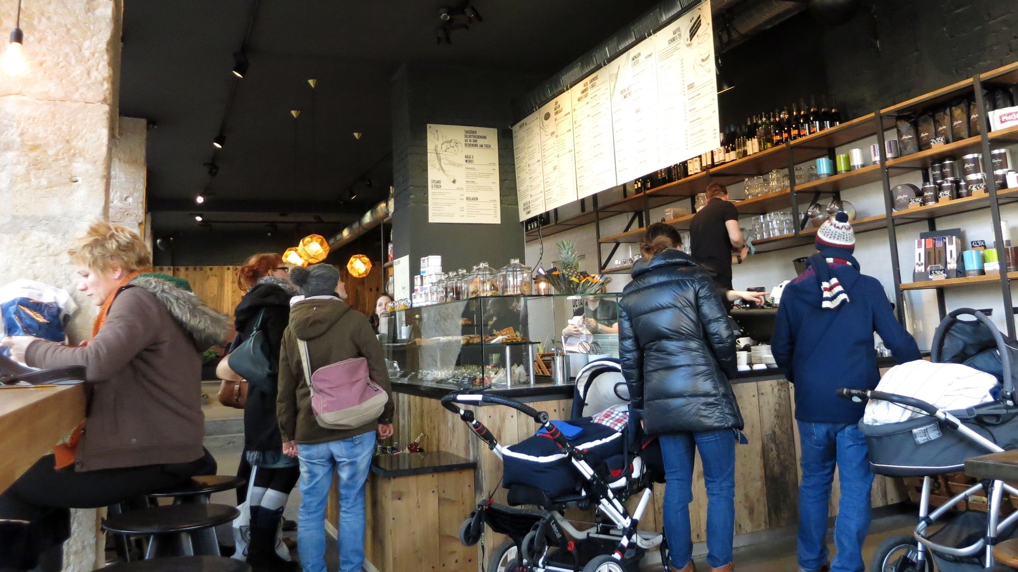Wir waren Sonntag morgen da und es war relativ viel los, hätte aber noch schlimmer sein können. Nur leider waren nur 2 Leute hinterm Tresen, da hat eindeutig jmd gefehlt. Der gute Mann der uns abkassiert hat, hatte genug damit zu tun und musste aber neben dem Bestellung aufnehmen noch Kaffee für alle machen und das Mädel war nur mit Saftpressen beschäftigt. Und ich muss sagen, die Karte ist absolut unübersichtlich. Es gibt viiiiel zu viele Auswahlmöglichkeiten! Zum Frühstück selbst jede Menge Angebote (relativ teuer wie ich finde) dann noch ne Eierkarte extra, Pancakes, Bagels und dann gehts weiter mit Pasta und und und und und… Wer soll das denn alles kochen? Weniger ist mehr, bin ich der Meinung. Und wenn ein großer Kaffe 4,20 kostet weil der normale Preis einfach verdoppelt wurde, naja… Da kann ich mir den auch wo anders holen. Eine Chance bekommt der Laden nochmal abends, wenn dann keine Selbstbedienung mehr ist.