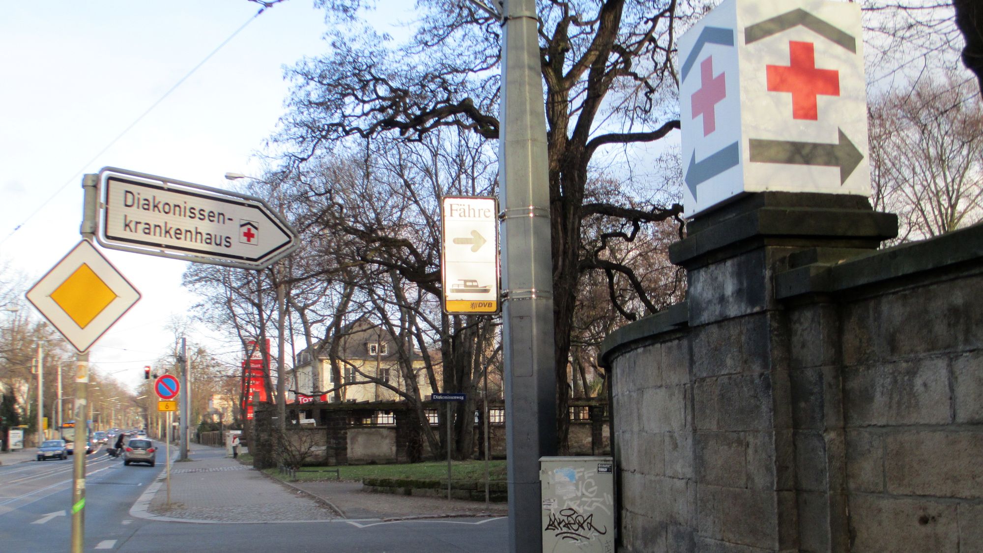 Der Diakonissenweg verläuft links am Krankenhaus-Gelände vorbei, macht einen scharfen Schlenker nach rechts und geht kurz hinter der Prießnitzquerung in die Holzhofgasse über, auf der offiziell das Diakonissenkrankenhaus ansässig ist. Namensgeberinnen waren die vier adeligen Gründungsmitglieder der Anstalt: Frau von Brause, Gräfin Louise Charlotte Hohenthal-Königsbrück, Frau von Leipzig und Baronin von Wirsing. Wären die Damen 2002 noch in der Diakonie zugange gewesen, hätten sie nasse Füße und feuchte Augen bekommen, denn die Elbe überschwemmte die Hälfte des Geländes bei der „Jahrhundertflut“. Doch im Normalfall plätschern Prießnitz und Elbe gemächlich dahin.