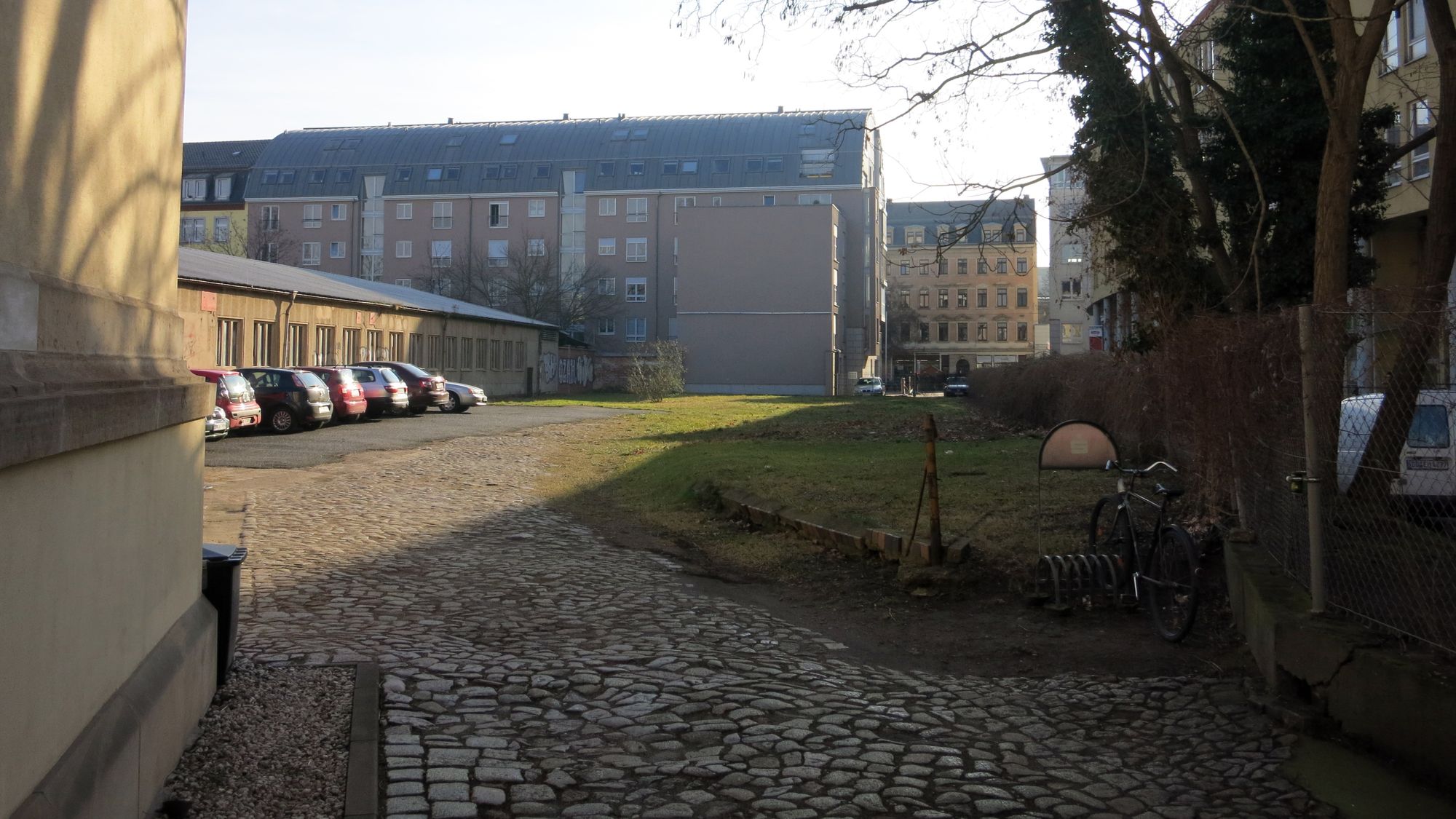 Die Fläche hinter dem Haus an der Königsbrücker Straße 8 gehört der Stadt Dresden und könnte vermutlich recht unproblematisch zur Alaunstraße hin geöffnet werden. Verhandlungen mit Anliegern und eine Abstimmung mit den Ämtern und den Kulturinitiativen steht noch aus. Jedoch sollen schon Anfang März erste Ergebnisse vorliegen.
