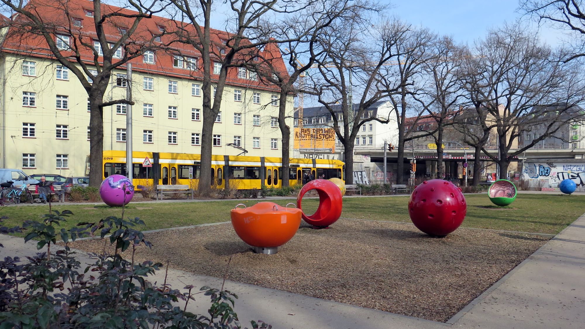 Womit der Bischofsplatz die Bezeichnung „Platz“ verdient hat, liegt in den nebulösen Verwicklungen der Historie verborgen. Er macht eher den Eindruck einer lebhaften Kreuzung, farblich aufgepeppt von „Hechtgrün“ und gleichfarbiger „Ecke“ – dem Pendant zur „Schiefen Ecke“ an Görlitzer-/Louisenstraße. Wo aus dem Späti die Substanzen fließen, beginnt Viertelkultur zu sprießen! Platz da, Platz gefangen, da macht der Bischof als „markanter stadtbildender Bereich“ keine Ausnahme.