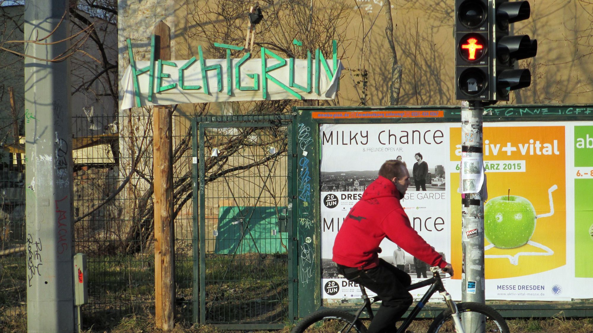 Geduldiges Warten gilt auch für das „Hechtgrün“. Zerzaust und unausgeschlafen sieht das Brachgelände in der Februarsonne aus. Nur die großen Metall-Lettern künden von den Sprossen und Trieben, die unterm Frost schlummern. Spätestens zum Hechtfest präsentiert sich das schlummernde Dornröschen als lauschiger urbaner Urwald und die Sonnenblumen drehen ihre Köpfe ins Licht. Die mobilen Beete, in denen zur Erntezeit seltene Kartoffelsorten und Mini-Möhrchen das Licht der Welt erblicken, halten bis zum ersten Garteneinsatz Winterschlaf, aber der Website der Gärtnerinnen und Gärtner der Rudolf-Leonhard-Straße 1 ist zu entnehmen, dass die grünen Däumchen nicht untätig gedreht werden. Die Buchstaben übrigens, die den Schriftzug „Der Hecht“ formen, hingen bis vor sechs Jahren an der Hauswand der Hechstraße 6. „Der elegante Meißner Herrenschuh“ war dort zu lesen.