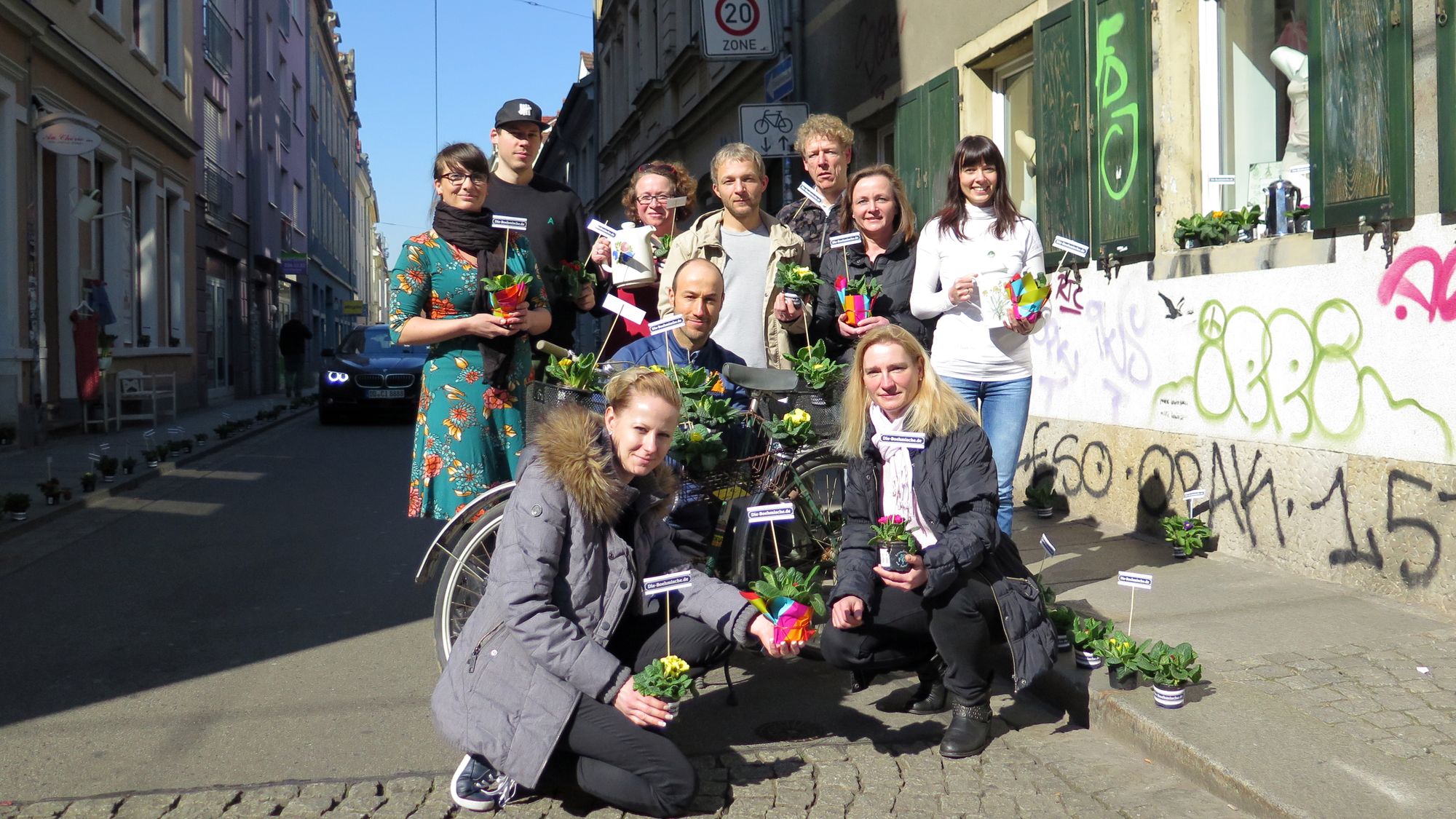 Die Händler mit ihren Primeln.Alle eint die Sorge, dass ihr kleiner Straßenabschnitt in der Neustadt ein wenig untergeht. Deshalb haben sie sich nun eine gemeinsame Website gestrickt und planen weitere Aktionen, die nächsten sind zu Ostern und zum Haus- und Hoftrödelmarkt im Mai geplant. Heute zum Frühlingsanfang begrüßen sie die Neustädter und Besucher nun erstmal mit den bunten Blümchen auf der Straße und in den Geschäften mit gratis Blümchenkaffee.