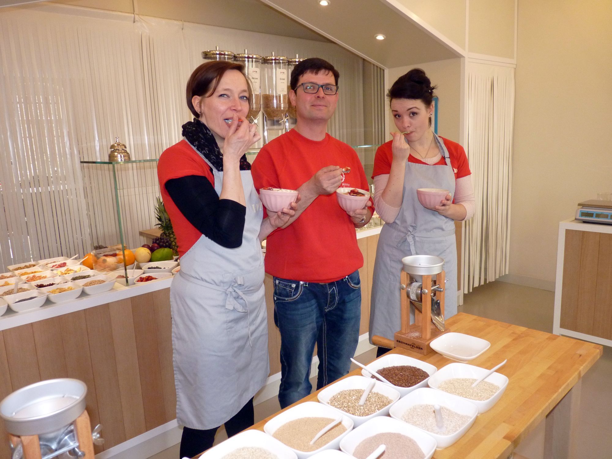 „Wir nennen unseren Laden ganz liebevoll nur noch FroYO“, erzählt Chefin Nadine Kaschel. Und da „FroYO“ – also der zu Eis gefrorene Joghurt in der Regel erst so aber der Mittagszeit konsumiert wird, hat sich die Inhaberin was Neues ausgedacht: „Um unseren Laden auch vormittags sinnvoll nutzen zu können, verwandelt sich das FroYO ab sofort von 7 Uhr bis 12 Uhr ins MüYO“, erklärt die 33-Jährige. Auch wieder in Selbstbedienung kann man sich ab sofort in dem Lädchen sein ganz persönliches Müsli zusammenstellen. Das bedeutet: Der Kunde wählt aus verschiedenen Körnern seine liebsten aus, quetscht sie mit der „Korn-Quetsche“ und dekoriert das Müsli dann nach Herzenslust. Der Fantasie sind bei den knusprigen Müsli-Kreationen keine Grenzen gesetzt. Bezahlt wird dann nach Gewicht, wobei 100 Gramm 1,80 Euro kosten.