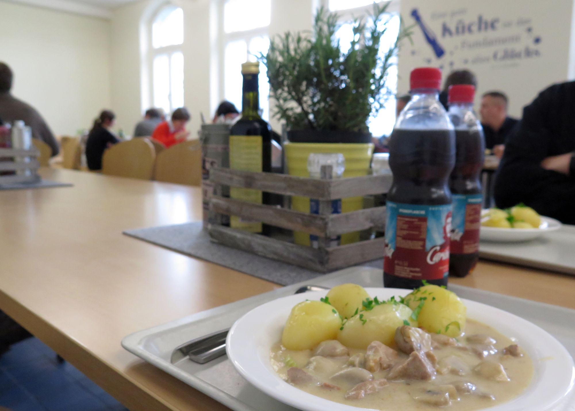 Gut sieht es aus, die Petersilie wird frisch drüber gestreut und für 4,80 Euro ist die Portionsgröße schwer in Ordnung. Das Fleisch zergeht auf der Zunge und entpuppt sich zur guten Hälfte als Champignons, die Soße lecker und würzig, die Kartoffeln sind frisch. Am Essen gibt’s nix zu meckern. Daumen hoch. Mein Bauch ist gut gefüllt. Einziger Wermutstropfen: So nett ein Fernseher in der Kantine für Einzeln-Speisende sein mag. Phoenix-Nazidokumentationen sind nicht unbedingt appetitanregend.