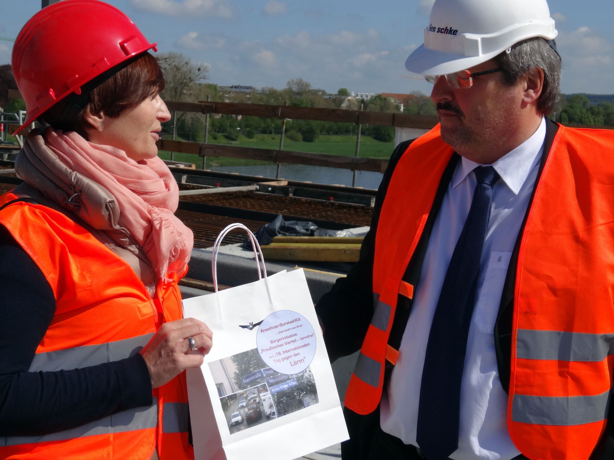 Das hatten die Dresdner Neuesten Nachrichten kürzlich umfangreich berichtet. Die komplette Sanierung der Brücke soll übrigens wie geplant im Sommer nächsten Jahres fertig sein. Für FDP-Chef Holger Zastrow dennoch ein Grund, eine Pressemitteilung herauszugeben: „Beinahe hat man es erwartet“, tönt er: „Die Sanierung verzögert sich und das obwohl der vergangene Winter quasi ausgefallen ist.“ Er weist in dem Zusammenhang darauf hin, dass die FDP sich seinerzeit für eine durchgängigen Offenhaltung für den Autoverkehr stark gemacht hatte. Die Leidtragenden, so Zastrow, seien vor allem die Anwohner des Preußischen Viertels, die jetzt mit Schleichverkehr zu tun hätten. Diese Anwohner meldeten sich heute auf der Brücke zu Wort und überreichten ein „Anwohner-Survival-Kit“ mit Ohrstöpseln.