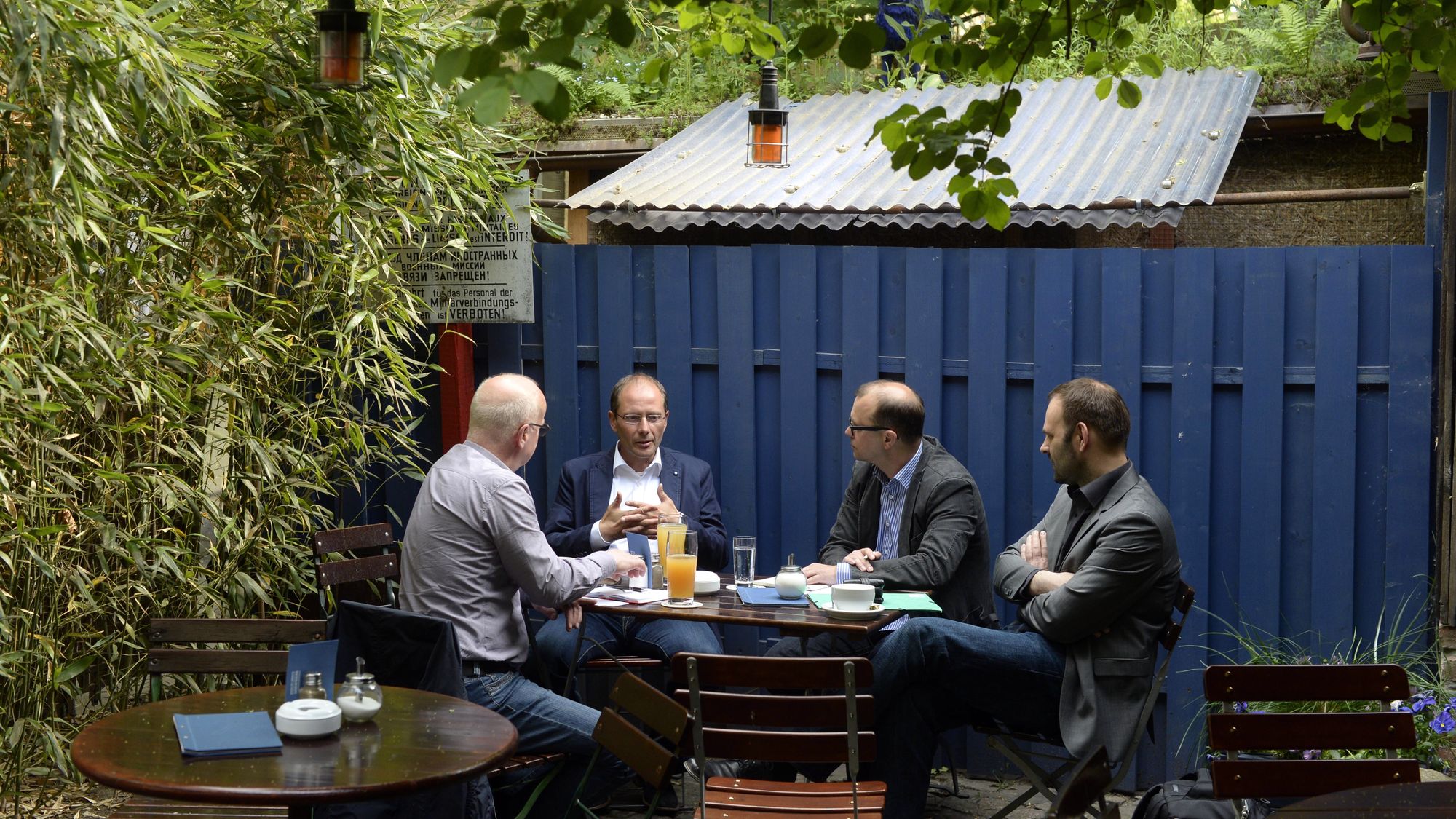 Markus Ulbig im Gespräch mit Winfried Schenk (menschen-in-dresden.de) und Jan Frintert (Neustadt-Geflüster) – Foto: Dehli-News.de/Frank DehlisSechs Kandidaten treten am 7. Juni zur Oberbürgermeisterwahl in Dresden an. Gemeinsam mit dem Online-Journal menschen-in-dresden.de haben wir alle Bewerber zum Interview eingeladen. Den Auftakt macht heute Markus Ulbig. Der CDU-Politiker aus Pirna ist aktuell sächsischer Innenminister – Treffpunkt: Raskolnikoff (Garten).