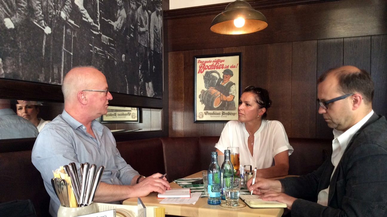 Es sind diese Fragen, mit denen sie ihre Antworten beendet, die das Gespräch unangenehm machen. Sie versucht, uns für Ihre Meinung einzunehmen. Das ganze entwickelt sich sogar soweit, dass unser Fotograf, der sonst brav nur die Bilder schießt, in die Diskussion einsteigt. Und ruckzuck sind wir bei der Medienschelte. Der Tagesspiegel würde gegen sie hetzen und bei der Springer-Presse gäbe es eine Direktive, Pegida schlecht zu schreiben. Der Journalismus solle sich mal wieder auf seine Wurzeln besinnen als vierte Säule der Demokratie. Sie sieht da eine große Konspiration zwischen Parteien und Medien. Immerhin, das Schlagwort „Lügenpresse“ fällt nicht.
