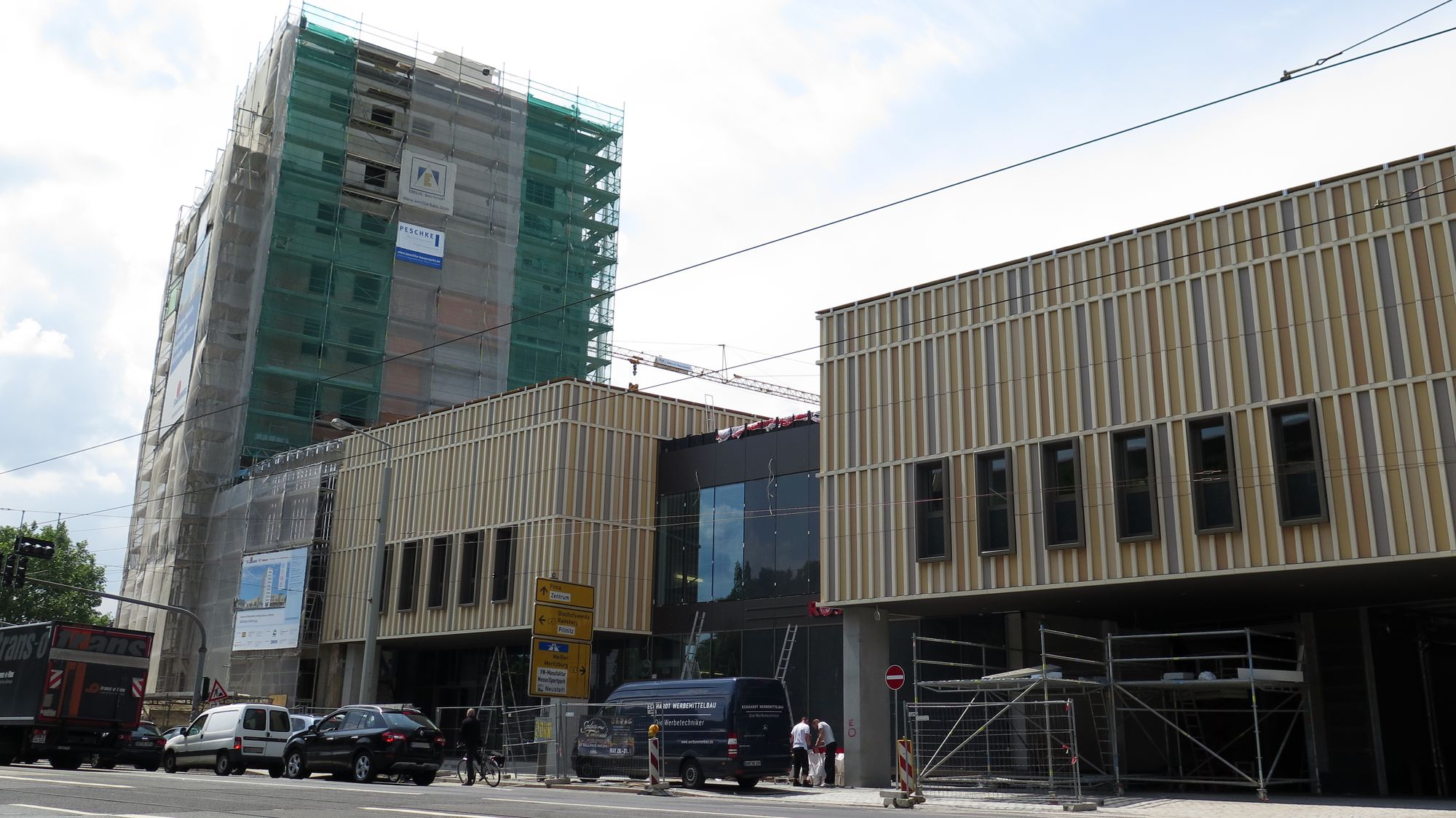 Hochhaus mit Anbau von der Königsbrücker Straße aus gesehen.Nächste Woche Donnerstag wird ein Teil des Einkaufszentrums am Albertplatz eröffnet. Im Simmel-Edeka-Markt, bei Aldi und Rossmann kann man dann schon einkaufen gehen. Gleichzeitig laufen am Hochhaus-Turm die Arbeiten aber noch weiter. Die obersten Etagen sind von außen aber schon fast fertig, die Fassade hat schon das künftige sehr weiße Cremeweiß bekommen. Etliche Fenster sind schon eingebaut und ab dem 2. Juli sollen dann auch die obersten Etagen des Gerüstes abgebaut werden.