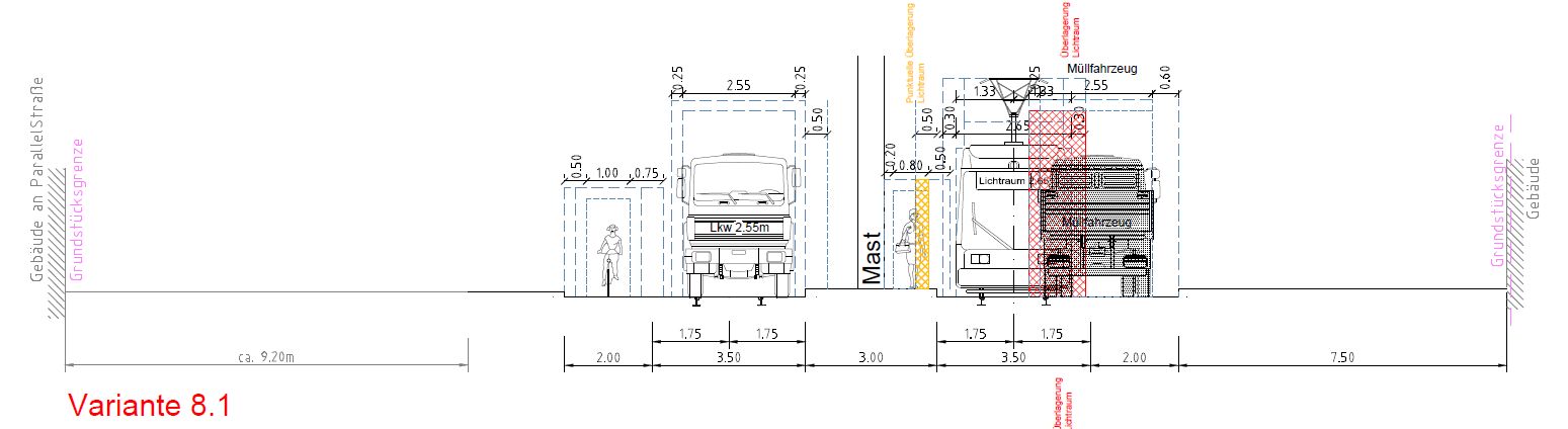 Das Problem mit dem Müllauto. Selbst wenn das den Radstreifen nutzt, käme die Straßenbahn nicht mehr vorbei.
