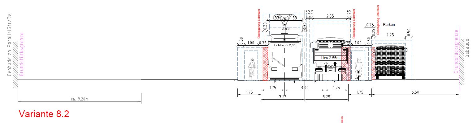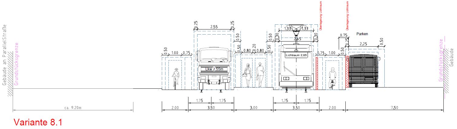 3. Ok, die neuen Varianten sind also ca. 2m breiter als der Bestand (der Preis, den man für vernünftige Radverkehrsanlagen zahlen muss). Dafür vollständige Mischung Straßenbahn + Kfz-Verkehr (wie es in der Praxis schon heute größtenteils gefahren wird).