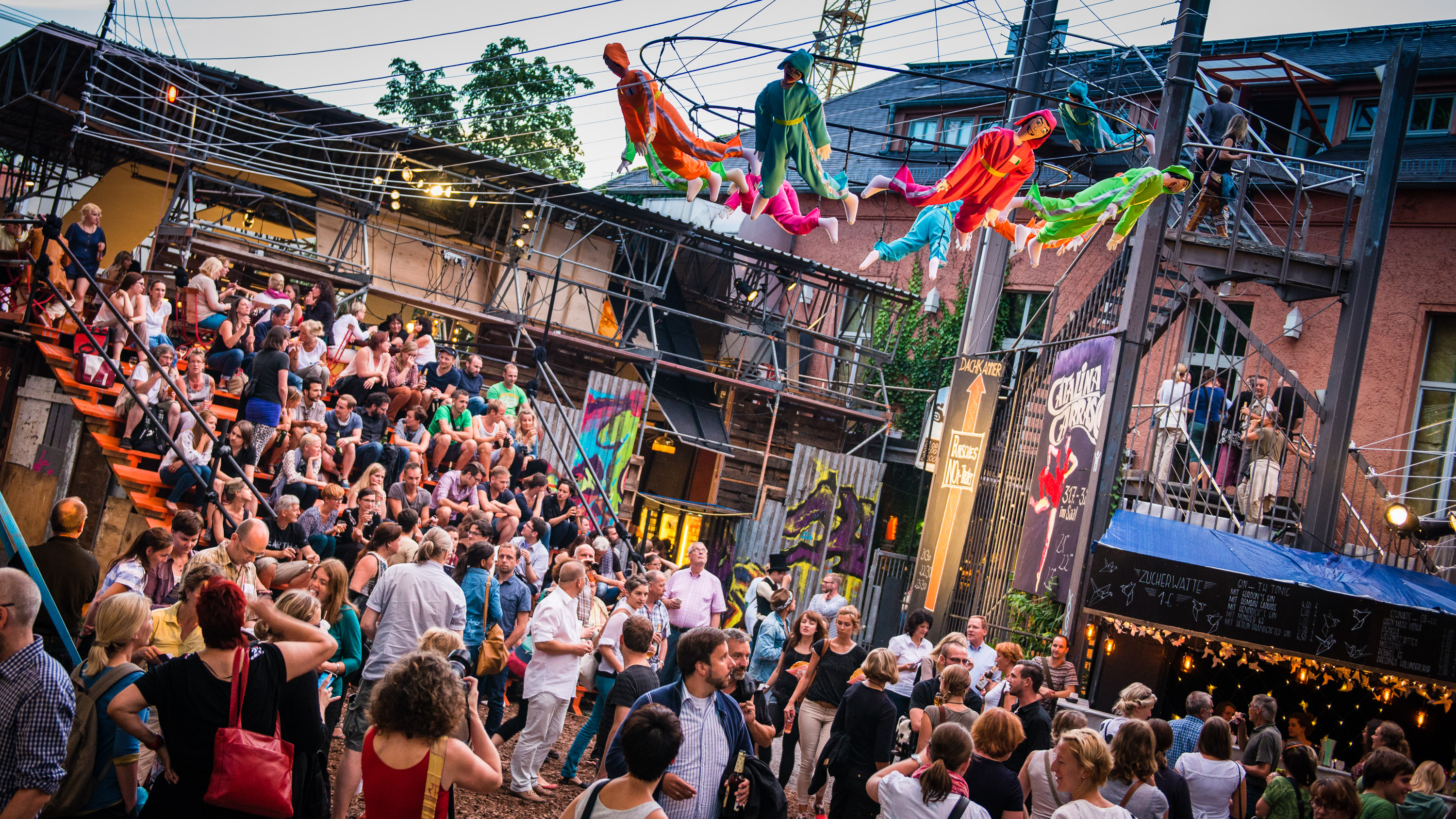 Oh weh, oh weh, die Puppen kreischen, singen fröhlich ihr Klagelied. Über den Sommer. Über die Gesellschaft. Über Tiere, Nerds und Akrobaten. Schillernd bunt, gar traurig schön, präsentieren sie sich in ihren Buden. „Seht uns an“ – Verführung pur! Der Blick bleibt haften, die Glieder zucken. Schau! Buden! Sommer! Zirkus des Lebens, was für ein Spaß! Elf Nächte tanzen und staunen. „Keine Angst! Seid ruhig verstört!“, warnen die Veranstalter. „Tanz in Zelten und an Stangen“, lautet ihr Versprechen. Der diesjährige Schaubudensommer steht im Zeichen der Volljährigkeit. Zum 18. Mal verwandelt sich der Scheune-Garten in einen Eintopf aus sommerlichen Schweiß, nackten Gliedmaßen und kunstvollen Attraktionen. Vom 16. bis zum 26. Juli, täglich, wenn der Tag in den Pyjama schlüpft, der Bauarbeiter die Schippe zu den Akten legt, kriechen die Puppen aus ihren Löchern und herrschen über das nächtliche Geschehen. Seid gespannt, es wird wieder einige Überraschungen geben.