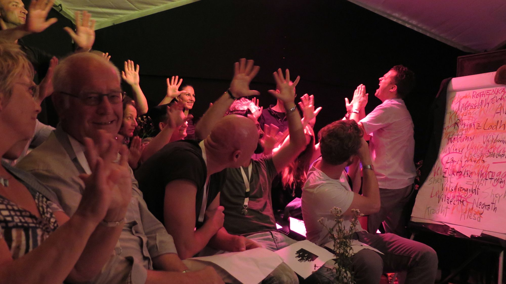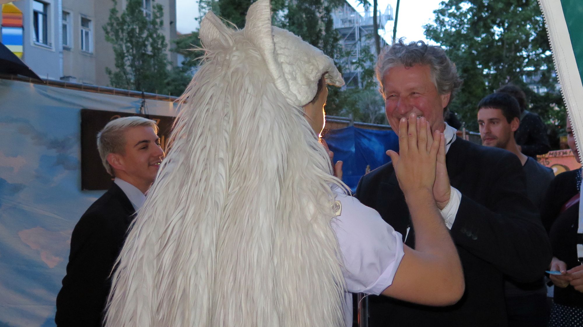 Helmut Raeder lässt sich heilen.Zuvor war ich schon ein wenig übers Festgelände gestrichen, wie üblich herrschte am letzten Sonntag nicht ganz so starkes Gedränge. Dafür hat sich die Abendsonne noch einmal richtig Mühe gegeben, die flatternden Bänder zu beleuchten. Das der Platz vorm Tresen vom Dach befreit wurde, eine gute Entscheidung. Bei Gitarren- und Akkordeon-Klängen ließ es sich prima schwatzen und gaffen. Für die „Echse“ reichte auch in diesem Jahr meine Ansteh-Geduld nicht aus. Die Schlange ringelte sich wieder quer über den Festplatz. Stattdessen habe ich mich einer Massenheilung hingegeben. Spruch des Abends: „Dresden ist die Wolfsschanze des Abendlandes.“ Auch sonst gab es tiefe Einblicke in braune Abgründe – irgendwie ganz schön anal. Und am Ende waren wir alle, inklusive Festival-Chef Helmut Raeder, ganz merkwürdig beglückt.