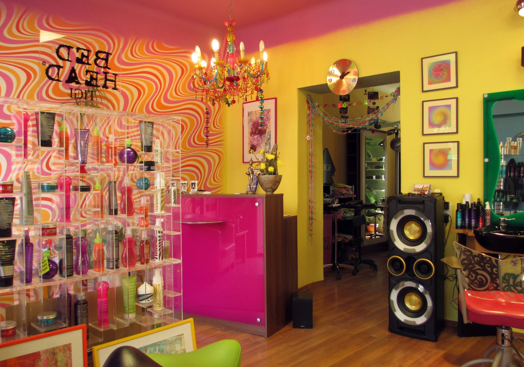 Bereits vor Alinas Salon auf dem Bischofsweg kündet ein Aufsteller in irisierenden Farben von der strahlend bunten Welt, die man in wenigen Sekunden betreten wird. Unter einem Kronleuchter, hinter einem pinken Tresen neben einer Wand, bemalt mit psychedelischen Spiralen steht Prinzessin Alina in ihrem Reich. Mit ihrem schwarzen Pony, die Lippen rot bemalt, im güldenen Gewand, sieht sie aus wie Kleopatra. Gerade verlässt eine Dame das Geschäft, im Schlepptau den fesch frisierten Enkel mit Hund. Es gibt eine herzliche Umarmung zum Abschied. Bis bald, adieu, Küsschen Küsschen – dann lässt sich Alina auf einen transparenten Stuhl sinken.