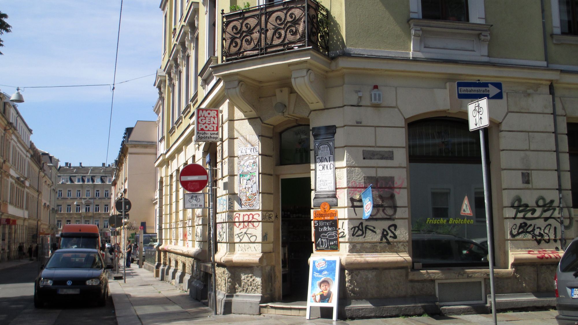 Ruhe kehrt auf Höhe des Spätshops, an der Kreuzung Förstereistraße ein. Hier gibt es ab 6 Uhr frische Brötchen und Sterni. Etliche Wandverzierungen zeugen von der Fantasie der Benutzer. Gleich nebenan erhebt sich fast klassisch das private College für Grafik und Medien. Noch ein kleines Stück weiter, versteckt in einem kleinen Hinterhof, teilt sich der Radiosender coloradio mit einer Zahnarztpraxis das Haus. Seit 1993 beglückt er auf 98,4 und 99,3 MHz mit Beiträgen aus Kultur, Region und Politik (und manchmal auch sehr langen Wortsammelpausen).