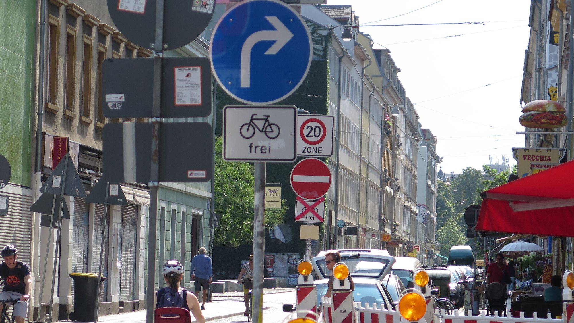 Ich glaube, irgendwann entwickeln diese Schilder auch ein Eigenleben, tauchen plötzlich auf, verschwinden, wandern umher. Sehr beliebt ist auch das Vergessen von Schildern nach längst beendeten Baumaßnahmen – die Unterführung Schlesischer Platz ist ein beliebter Märchenwald aus (nun sehr vereinsamten) Schildern.
