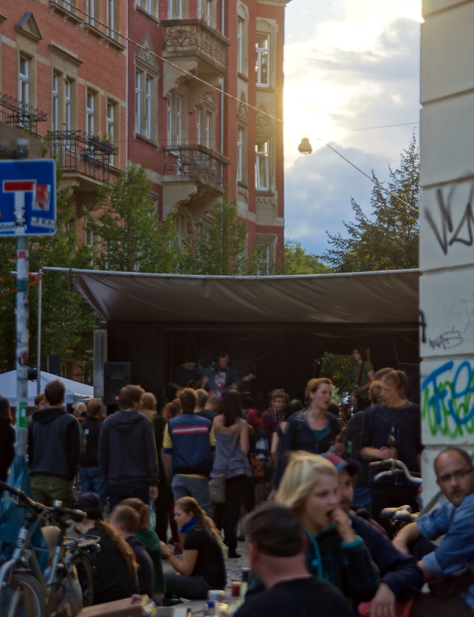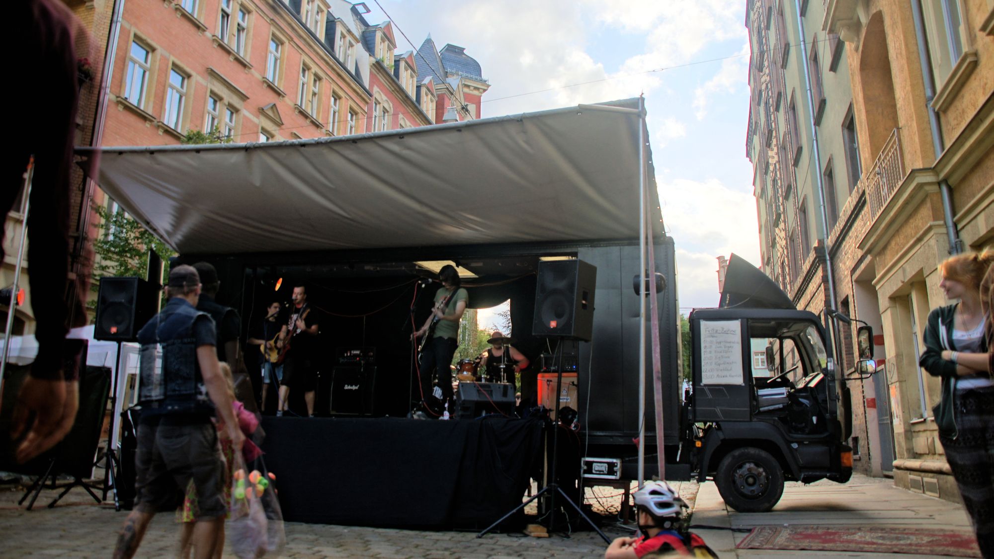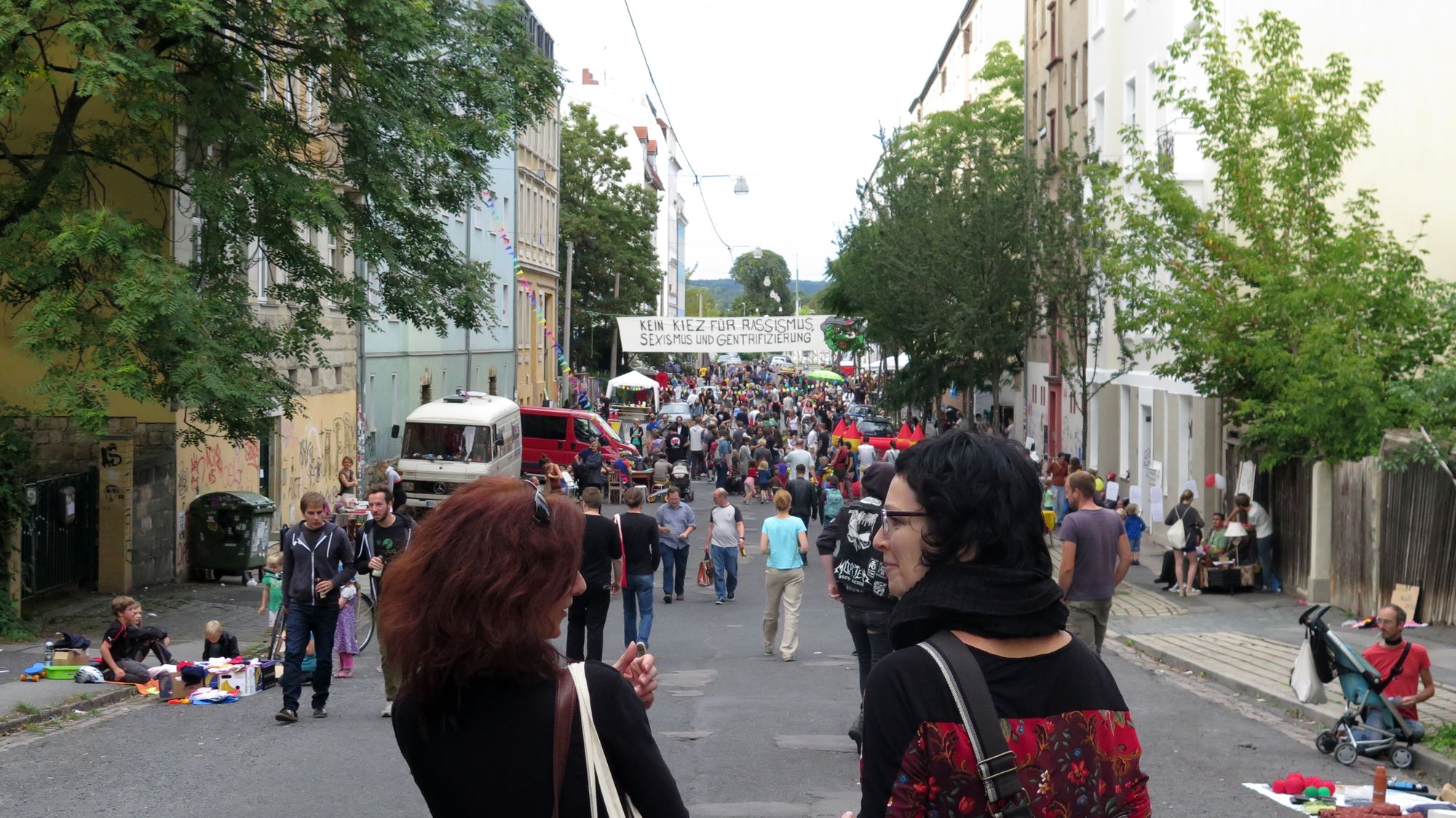 Ein kleines Mädchen flitzt an mir vorbei. Sie ist furchterregend schwarz und violett geschminkt. Ein paar Jungs mit Wasserspritzen setzen ihr nach. Sie nehmen zwar keine Rücksicht auf Erwachsene, haben aber doch keine Chance. Ich bin mittendrin im bunten Trubel auf der Rudolfstraße. Neben mir der Kinderschminktisch, vor mir eine Reihe Luftballons, dazwischen die flitzenden Knirpse. Linker Hand ein Zelt. In Vortragsstimmung bin ich jetzt nicht gerade, doch ich sehe, auch dort sitzt jemand drin. Ein paar Meter weiter eine Folk-Band mit Geige und Gesang. Das Publikum sitzt gemütlich auf dem Spielplatz Ottostraße.