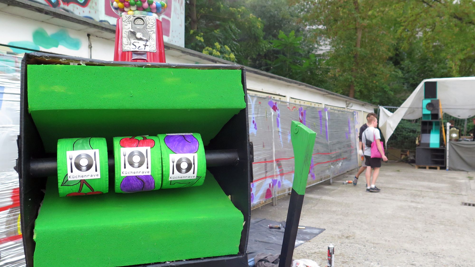 Punkrock im CampingstuhlIm Garagengelände wird gesprüht. Ein riesiger Spielautomat soll zum Spenden animieren. Apropos Spenden. Auf dem ganzen Fest gab es nur freiwillige Preise. „Das hat funktioniert“, berichtet Sebastian vom Organisationsteam. „Wir sind uns sicher, dass wir die Unkosten wieder eingespielt haben.“ Falls es einen Überschuss gibt, soll der weitergespendet werden. Die vier Vereine, die bedacht werden sollen, wurden vorher von den Anwohnern ausgesucht.