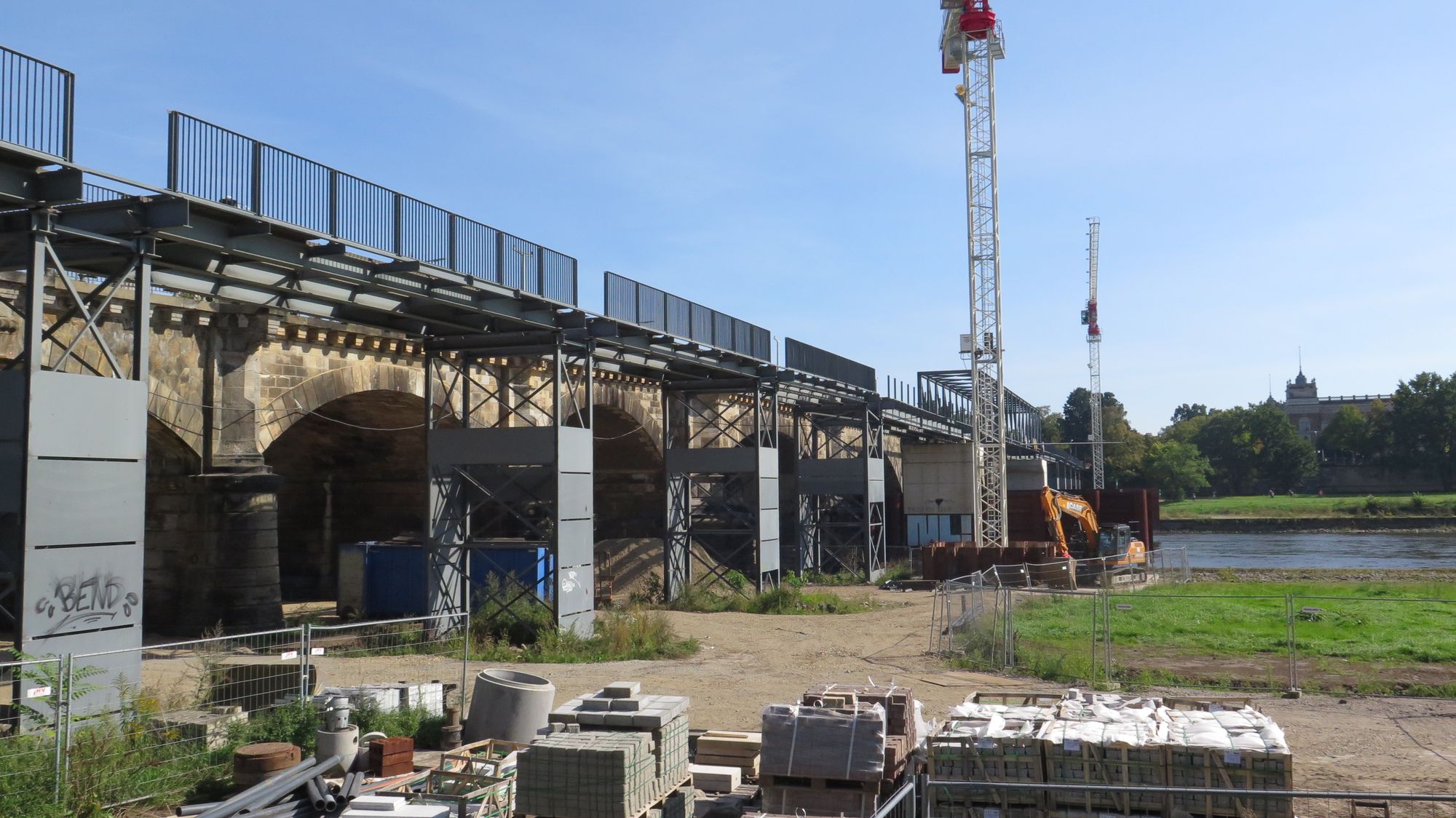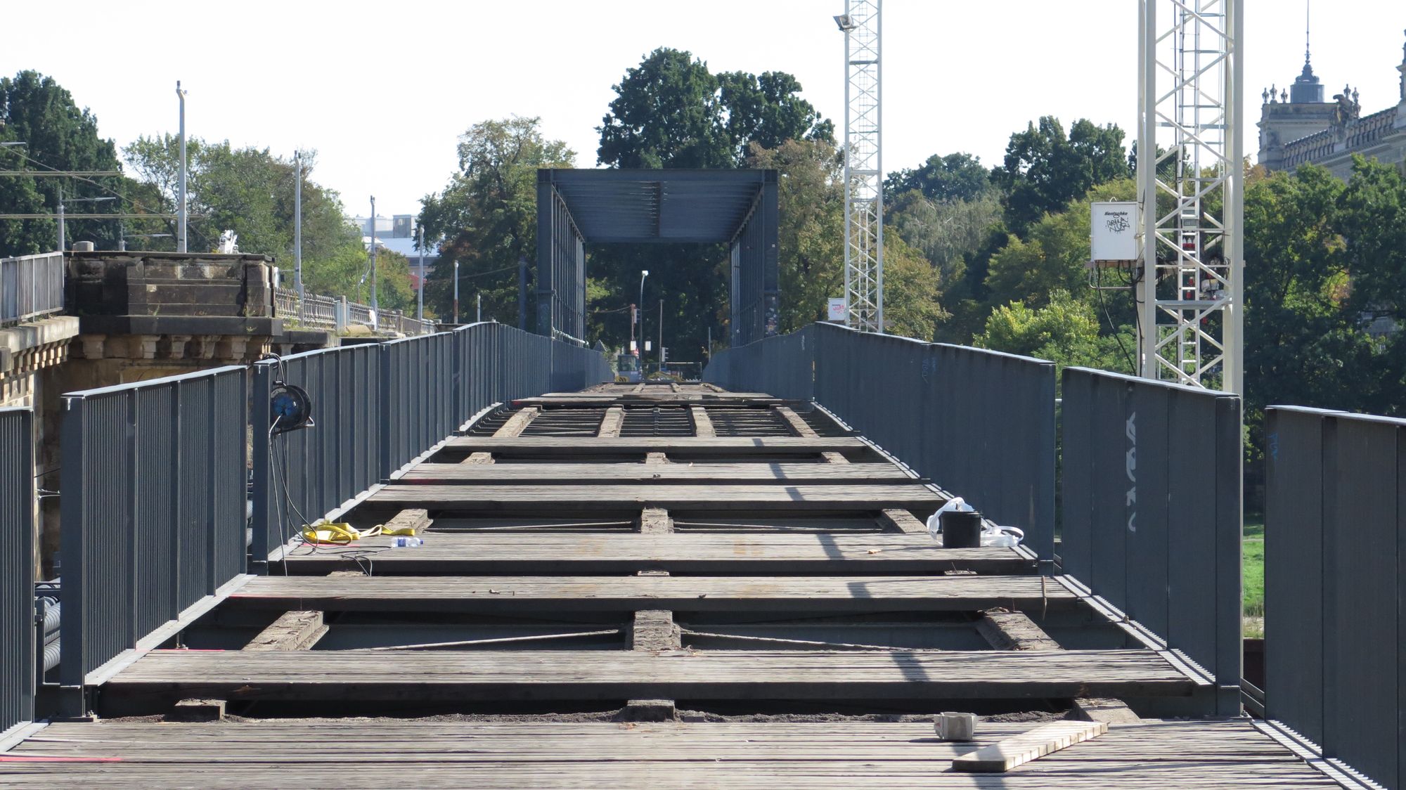 Schweißer demontiert die BehelfsbrückeSeit heute Morgen wird nun die Behelfsbrücke demontiert. Mit einem riesigen 1.500-Tonnen-Autokran wurde das Mittelstück abgehoben und ans Elbufer gelegt. Dort wird es derzeit mit dem Schweißbrenner demontiert. Die Demontage der Vorlandbrücken ist bereits abgeschlossen. Das verbleibende Randfeld über dem Uferbereich der Altstädter Seite wird ab 12. Oktober demontiert. Der Rückbau der Leitwerke und Pfeiler in der Elbe erfolgt bis Februar 2016.