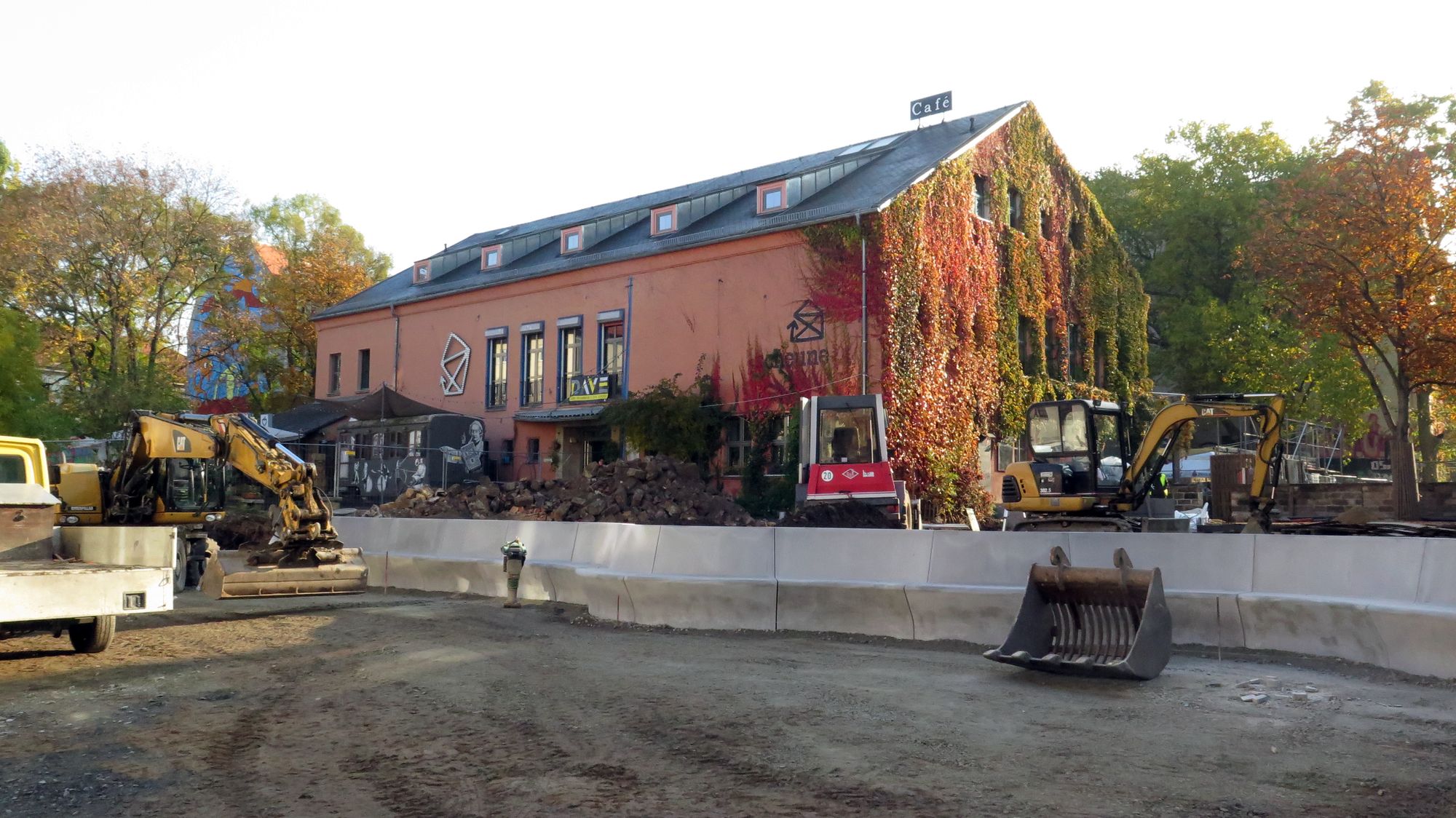 Bislang liege man gut im Zeitplan, so Undine Neubert. Beim Wegbaggern der alten Mauer sind die Arbeiter auf Kellergewölbe gestoßen. „Hier kann man gut erkennen, dass die Alaunstraße an der Stelle einst bis zum Fußweg hin bebaut war.“ Vor den Gewölben liegt ein kleiner Erdhaufen, hier soll dann künftig ein Baum stehen. Im kommenden Frühjahr soll der Platz fertig sein.