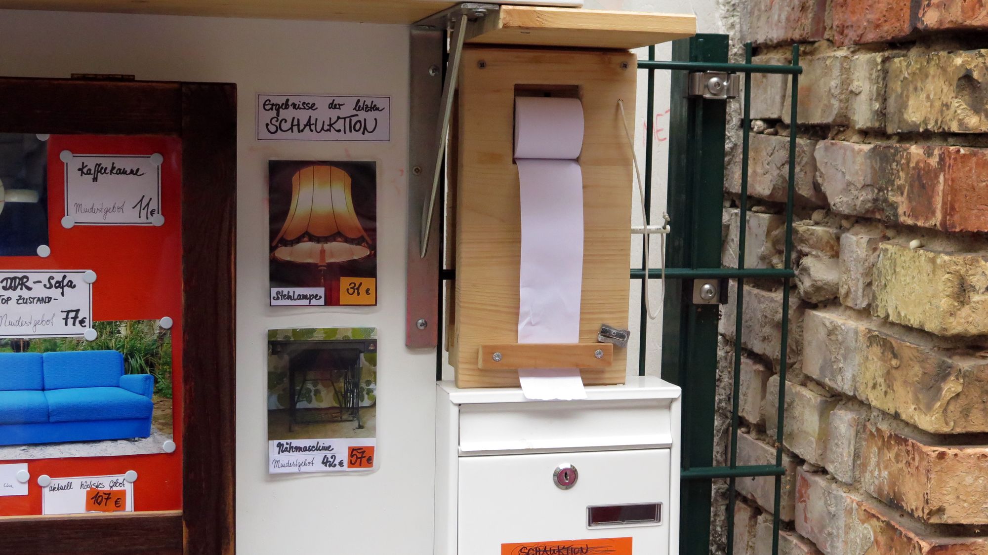 Nun, der Mitbewerber ebay kann sich wohl warm anziehen. Denn die Technik ist herausragend und zukunftsweisend. Die Angebote (unter anderem ein farbenfrohes Polster-Möbel und komplementär gestaltete Kaffeekanne) werden mittels Fotografien ausgehängt. Der geneigte Interessent kann auf einer angehängten Notiz-Zettel-Rolle mit dem ebenfalls angehängtem Stift sein Angebot notieren und in dem daneben platzierten Zettelkasten einwerfen. Neben klassischen Auktionen stehen auch einzelne Produkte zum Sofort-Verkauf mit Festpreis auf der Angebotstafel.