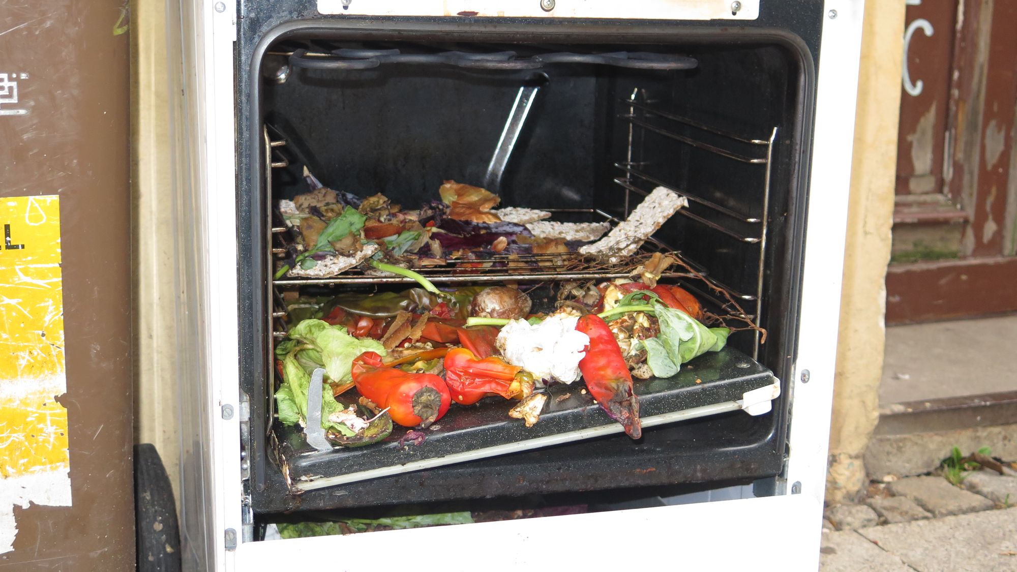 Auf der Görlitzer Straße steht ein Herd. Auf dem schlichten Zettel steht: „Zum Mitnehmen“. Ob damit die nicht mehr ganz taufrischen Paprika-Schaschliks gemeint sind oder der ganze Herd, bleibt unklar.