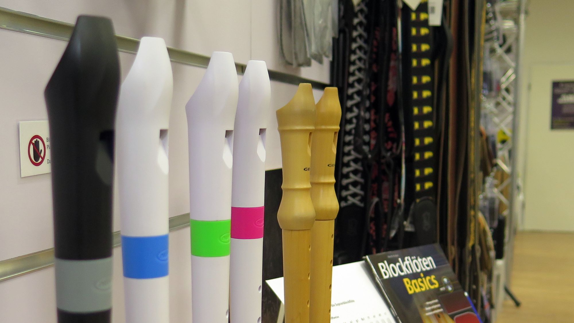 „Die neue Lage hat uns auch neue Kunden verschafft“, erzählt Hanta. Mehr Laufkundschaft sei hier neben dem Lebensmittel-Discounter auf jeden Fall vorhanden. Angefangen hat er als Plattenverkäufer, daher auch der Name des Ladens, bald kam DJ- & Studio-Equipment dazu, später dann „richtige“ Instrumente, Gitarren und Co. gibt es seit 2008. Neben dem Verkauf verleiht er auch Intrumente. Im neuen Laden wurde das Bläser-Angebot ausgebaut. Stolz zeigt Hanta seine Flöten-Wand.