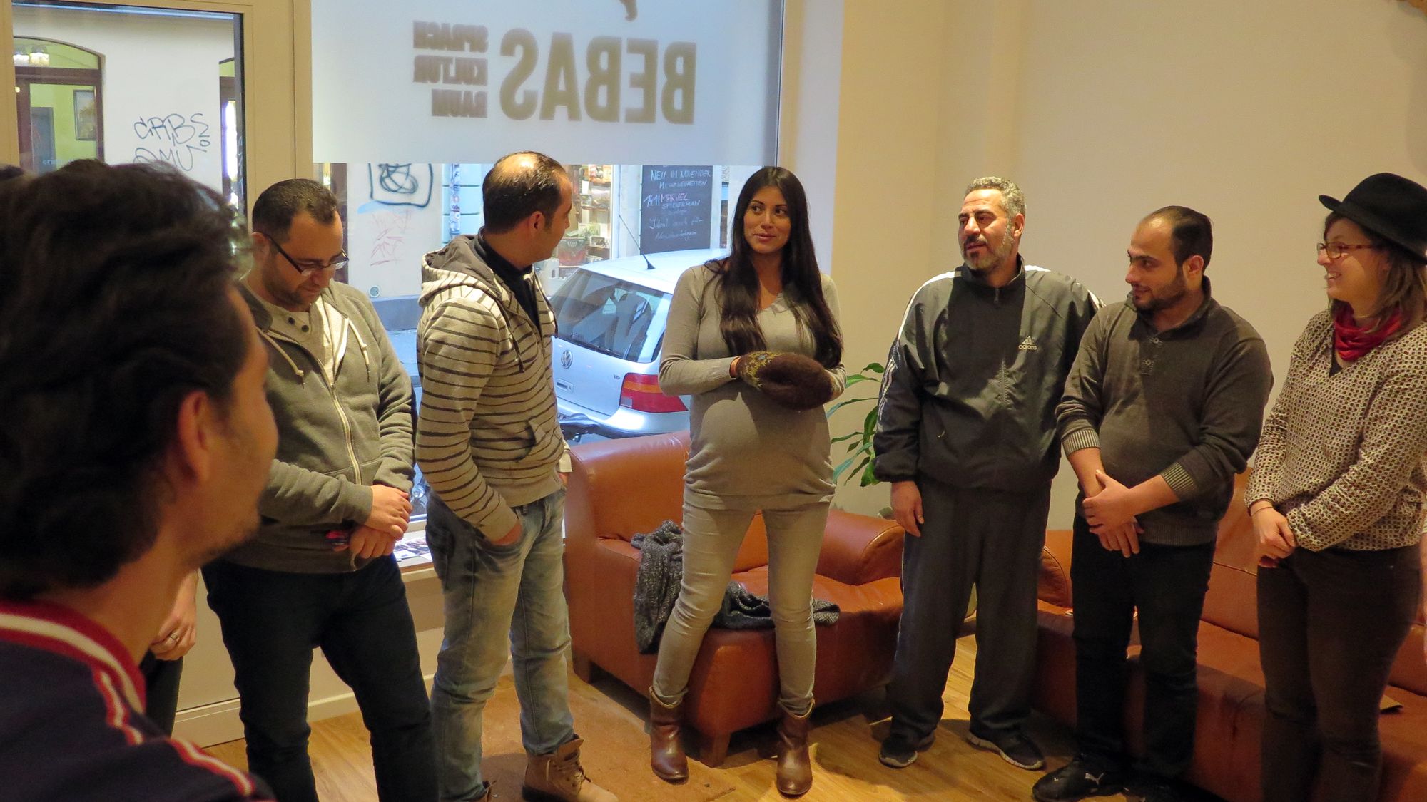 Karin Barrios im Kreis der Lernenden.Die frisch gegründete Sprachschule Bebas auf der Martin-Luther-Straße führt Sprachkurse für Flüchtlinge durch. Und da die Förderung solcher Kurse nicht jedem gewährt wird, unterrichten sie einfach ein paar Männer gratis.