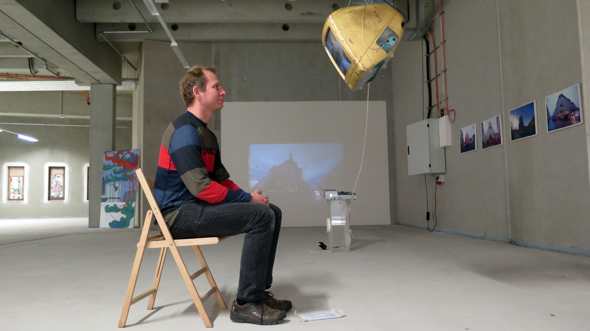 „Der Nahseher“ – Künstler Georg Knobloch inmitten seines Werkes.Zu den Künstlern gehört auch der Fotograf Georg Knobloch, der in der Ausstellung mit einer Installation vertreten ist. „Nahseher 2.0“ heißt sie, auf dem mit Blatt-Gold veredelten Uralt-iMac läuft ein Bilderradio-Interview. „Die Räume sind großartig“, schwärmt er. „So riesig, so kahl, da hat man als Künstler alle Möglichkeiten“.