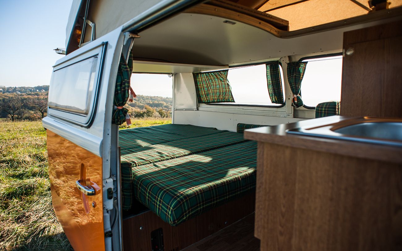 Das Konzept ist schlicht. Er sucht nach alten Campern, die zum Teil schon ein paar 100.000 Kilometer auf der Uhr haben. Mit Hilfe eines Mechanikers werden die aufgemotzt und dann gibt es für die Interessenten 70er Jahre Urlaubsgefühl für kleines Geld. Die Preisliste beginnt bei 50,- Euro pro Tag in der Nebensaison für die Low-Budget-Camper. „Unsere Preise sind fair und transparent“, sagt Böcky. Vor allem sind sie leicht zu verstehen und ermöglichen auch einen Urlaub mit relativ kleinem Budget. „Wir campen selber gern und tauschen diese Erfahrungen mit unseren Kunden aus“, berichtet er. Da kann ein Übergabe-Gespräch schon mal in Fachsimpelei über die besten Stellplätze in Norditalien enden. Der Kontakt zu den Kunden ist ihm wichtig. Die Einweisung in das Fahrzeug dauert in der Regel eine Stunde. „Wir fertigen unsere Kunden nicht einfach ab“, versichert Böcky.Bruno: innen ist er ein echter CamperBruno ist einer der letzten seiner Art. „Eine Kostbarkeit, die erhalten bleiben muss“, schwärmt Böcky. Der Bus hat schon mehr Jahre auf dem Buckel als sein Vermieter und schnurrt immer noch prächtig. Ausgestattet mit Kühlbox, vier Schlafplätzen, Herd und Hochdach kostet er 100,- Euro pro Tag. Dafür kann man ihn auch für kurze Zeit mal auf den Alaunplatz stellen und keiner ist wirklich böse. Neugierige Kinderblicke sind garantiert.