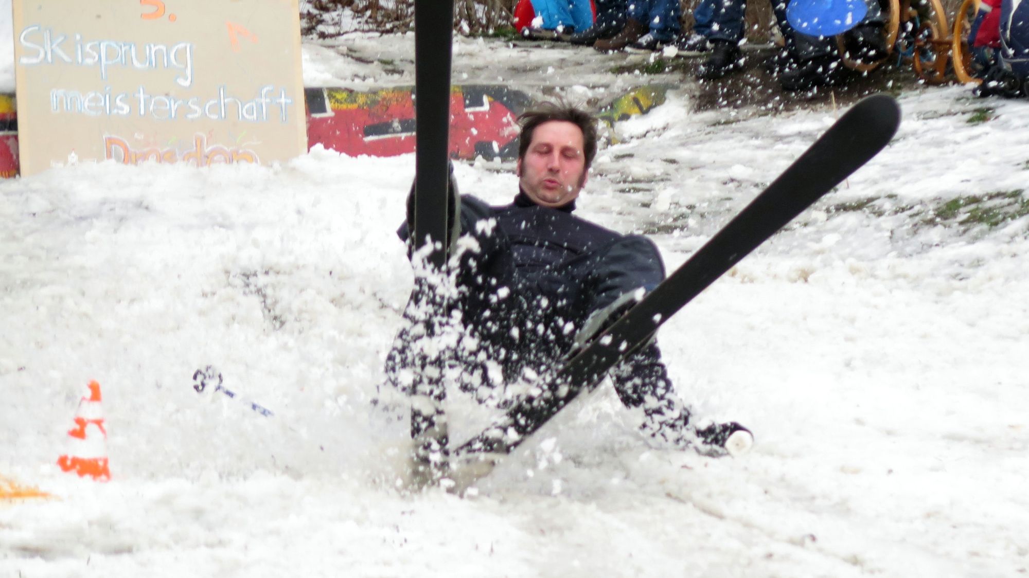 Wenn es irgendwann mal Haltungsnoten gibt, hat auch er eine Chance.Heute Mittag fand auf der Pionierschanze am Alaunplatz das fünfte große Dresdner Skispringen statt. Hunderte Neustädter und Besucher ließen sich das Spektakel nicht entgehen. Der langjährige Dauersieger Jens W. aus O. wurde entthront.Perfekte Haltung, weitester Sprung, 8,50 Meter reichten zum Sieg.Der Sieger des diesjährigen Weitflugspektakels heißt Robert G. und ist Randneustädter und wettkampferfahren. Mit einer Weite von 8,50 Metern blieb er zwar weit hinter dem Schanzenrekord aus dem Jahre 2012 zurück, doch in Anbetracht der kläglichen Schneereste war das dann aber doch eine sehr gute Leistung. Vorjahressieger Jens W. gab sich zerknirscht: „Gegen solche Semi-Profis habe ich natürlich keine Chance.“ Robert G., der nicht nur eine Pulle Fusel, sondern auch einen Katzenkalender und den noch nicht fertigen Wanderpokal abstaubte: „Ein toller Wettkampf, solch ein Atmosphäre hab ich noch nicht erlebt.“ Seine Hock-Sprung-Technik war heute die optimale Lösung, er landete damit weit vor der Konkurrenz.